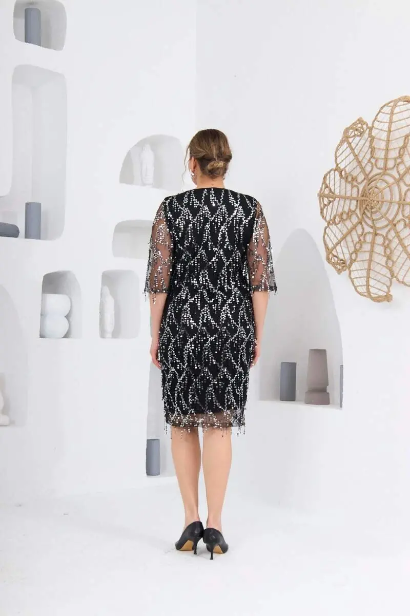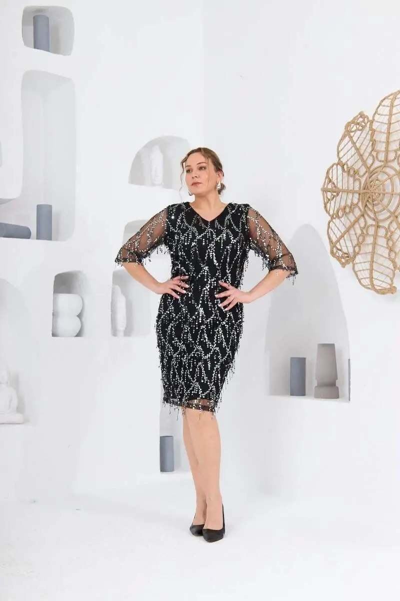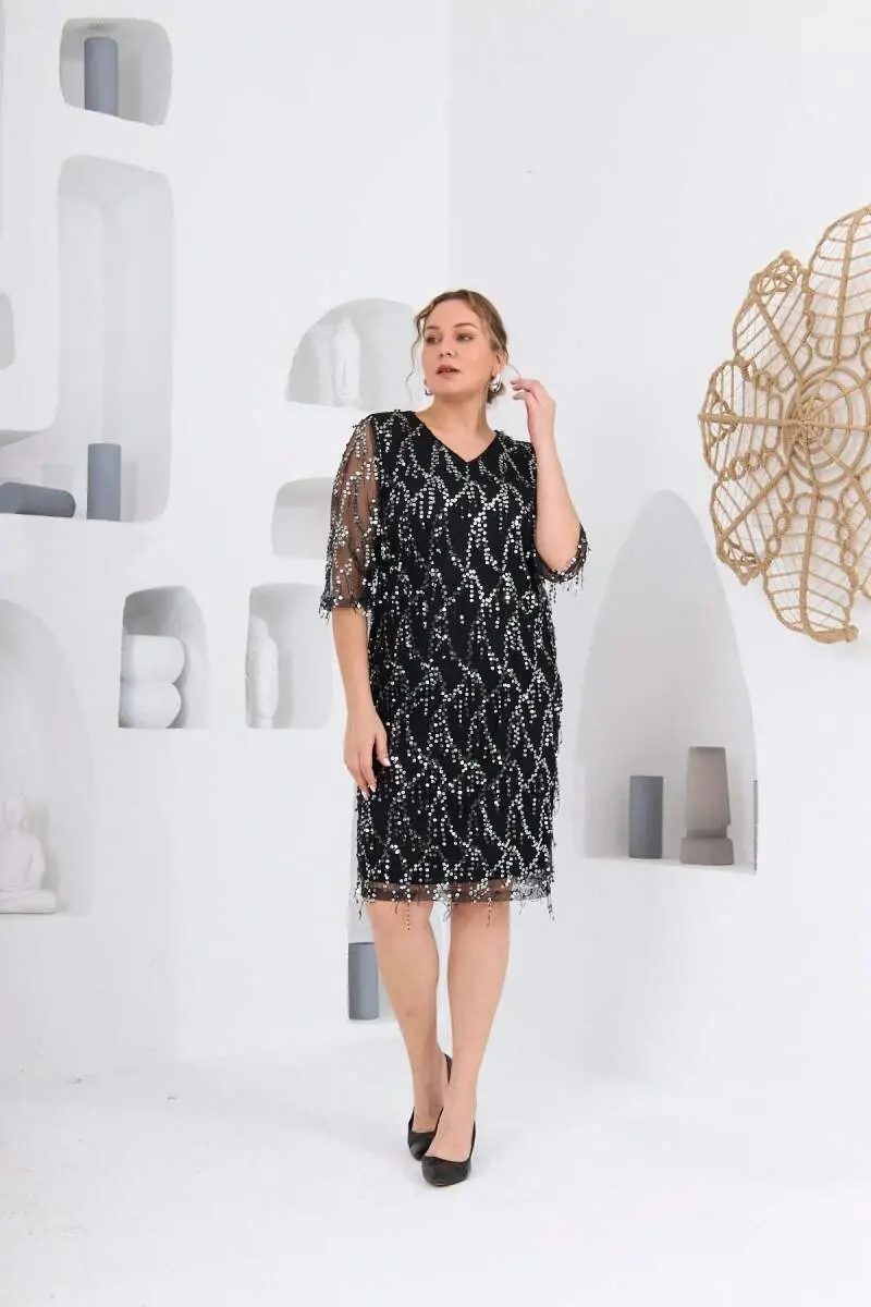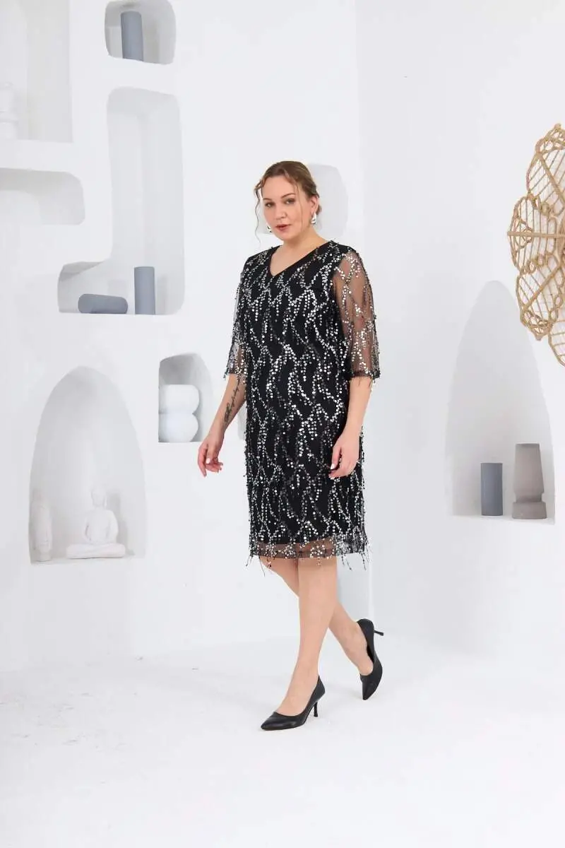 Pul Payet V Yaka Abiye Şifon Büyük Beden Elbise Siyah