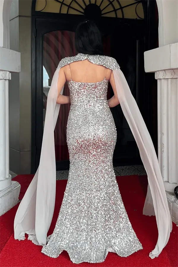 Pullu Payet Kumaş Pelerin Detaylı Abiye Elbise - GOLD