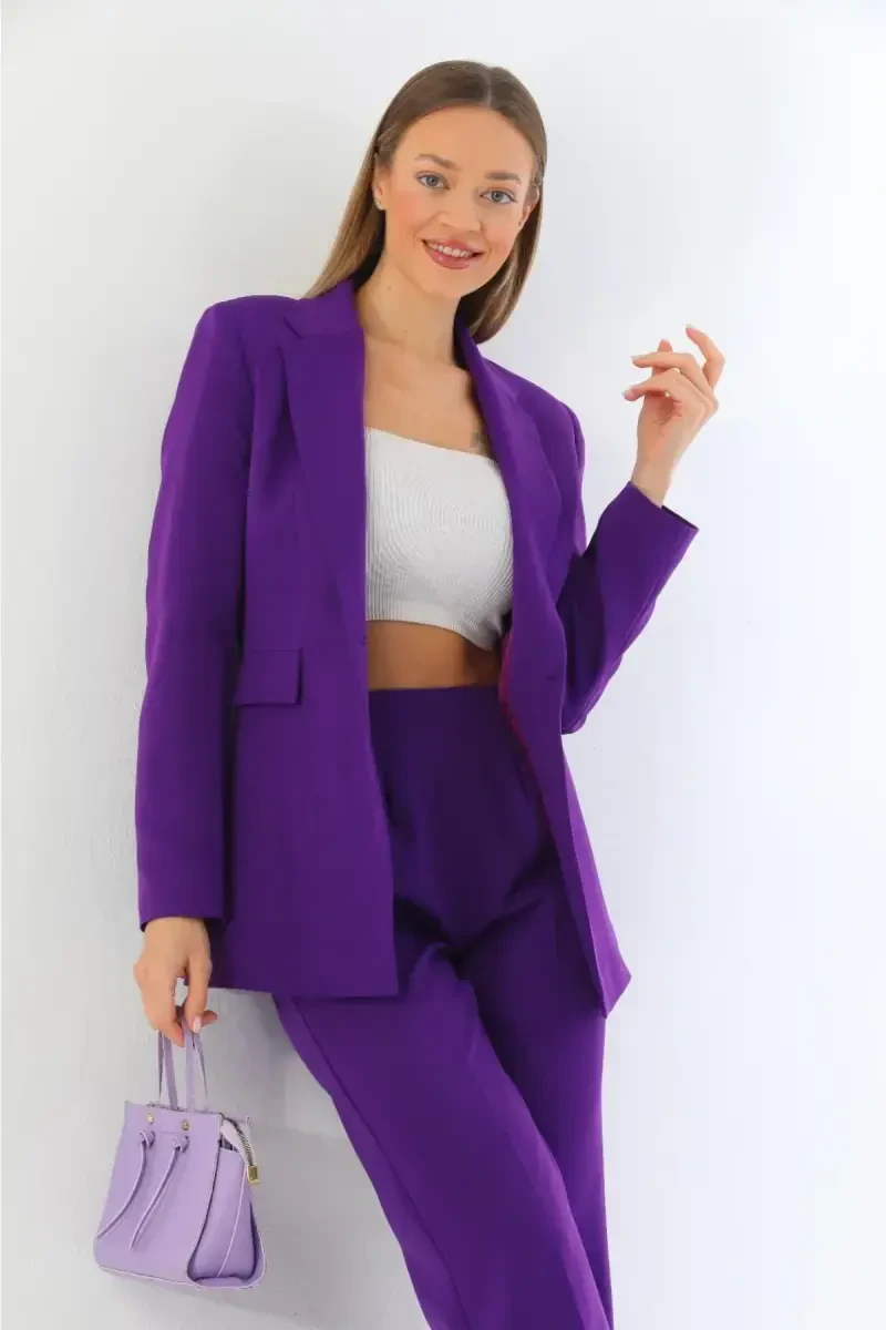 Our Purple Single Button Blazer Jacket with Pocketed Palazzo Pants Set is a combination that brings together elegance and comfort, and is a candidate to be an indispensable part of your wardrobe. Whether at a special event, a stylish dinner, or in everyday use, this suit reflects your style and highlights the elegance of the modern woman.Product DescriptionOur Purple Single Button Blazer Jacket with Pocketed Palazzo Pants Set is made of high-quality fabric that offers a modern and sophisticated look. The most striking piece of the suit, the blazer jacket, gently emphasizes your body lines with its single button detail and creates a stylish silhouette. The pockets on the sides of the jacket offer functionality and add a modern touch to the design. The blazer jacket, which provides comfortable use all day long thanks to its inner lining, is also remarkable with its shoulder and collar details. The palazzo pants, on the other hand, offer both comfort and elegance with their high waist cut and wide leg design. The palazzo pants, which do not restrict your freedom of movement, make your legs look longer and give you a more elegant appearance than you are. The flowing structure of the fabric creates a pleasant look on you, while its non-iron feature offers practical use. Carrying the nobility and attractiveness of the color purple, this suit can be easily combined with different accessories and shoes. Whether you attend a stylish event with heels or catch a casual elegance with sneakers, our Purple Single Button Blazer Jacket with Pocketed Palazzo Pants Set allows you to show off your style in any environment. This suit is not just a piece of clothing, but also a stance. This suit, which is the choice of a self-confident, stylish and modern woman, will be one of the most valuable pieces of your wardrobe. Thanks to its special fabric structure, our suit offers long-lasting use, is resistant to color fading, and maintains its first-day vitality for a long time. This suit, which is suitable for every body type with its different size options, offers a perfect fit and comfort. Step into the magical world of purple and redefine your style with our Purple Single Button Blazer Jacket with Pocketed Palazzo Pants Set. This suit, which contains care and quality in every detail, will take you one step further in any environment. Remember, style is not just a piece of clothing, but also a lifestyle. Reflect your style and make a difference with our Purple Single Button Blazer Jacket with Pocketed Palazzo Pants Set. This special suit, which should definitely be in your wardrobe, is waiting for you.Product Features* Single button blazer jacket* Pocketed design* Palazzo pants* High waist cut* Wide leg* Comfortable fabric structure* Stylish and modern design* Different size options* Long lasting use* Resistant to color fadingAdditional InformationThe size on the model is 36. Fabric content: 95% Polyester, 5% Elastane. Machine washable at 30 degrees. Does not require ironing.