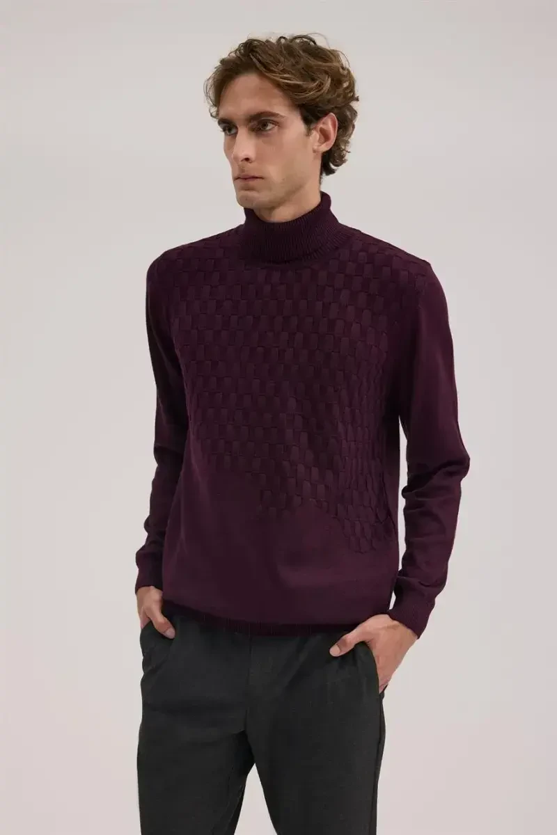 Elevate your style with the Purple Slim Fit Patterned Turtleneck Knitwear. This stylish and modern knitwear is an ideal choice for both daily wear and your special occasions. The slim fit cut sits perfectly on your body, creating a flawless silhouette, while the patterned design adds a unique touch to your outfit. The turtleneck detail keeps you warm in cold weather while adding a sophisticated touch to your style. Thanks to its high-quality blend of polyester and viscose fabric, it is both durable and comfortable. Its soft texture feels pleasant on your skin and ensures you feel comfortable all day long. Draw attention with the vibrancy and energy of the purple color. This knitwear is a candidate to be one of the indispensable pieces of your wardrobe. You can easily combine it with your jeans, chinos, or fabric trousers to create different styles. This knitwear, which you can easily use in the office, at school, at a dinner, or on your weekend trips, adapts to any environment. It is the perfect choice for men who want to catch comfort without sacrificing their elegance. Catch the trend and feel good with the Purple Slim Fit Patterned Turtleneck Knitwear.