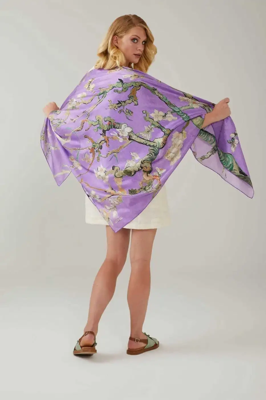 This enchanting shawl is inspired by the works of renowned artist Vincent Van Gogh. The delicate beauty of almond blossoms, brought to life with vibrant purple hues, creates a stunning design. Crafted from 100% satin silk, this shawl will captivate you with its soft texture and elegant appearance.