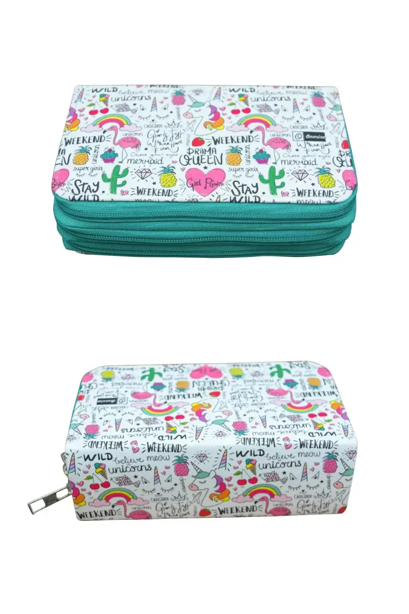 qalam qutisi, unicorn, kawaii, vegan charm, uch bo'limli, qalamdon, maktab, ofis, kanselyariya, yashil fermuar