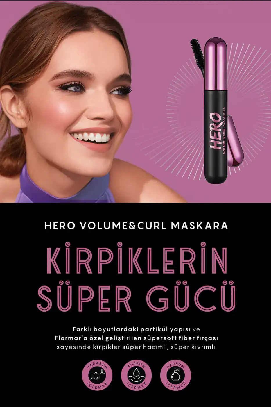 Hero Volume & Curl tuşi bilan kirpiklaringizga hech qachon ko'rmagan hajmingiz va kıvrıqlaringizni qo'shing. Kirpiklaringizni uzaytirish, kıvrıq qilish va hajmini oshirish uchun mo'ljallangan bu tuş sizga ajoyib ko'rinish bag'ishlaydi. Maxsus ishlab chiqilgan cho'tkasi har bir kirpikka mukammal tarzda yetadi va intensiv rang va hajmni ta'minlaydi. Formula kirpiklaringizni oziqlantiradi va kun bo'yi mukammal ushlab turadi.