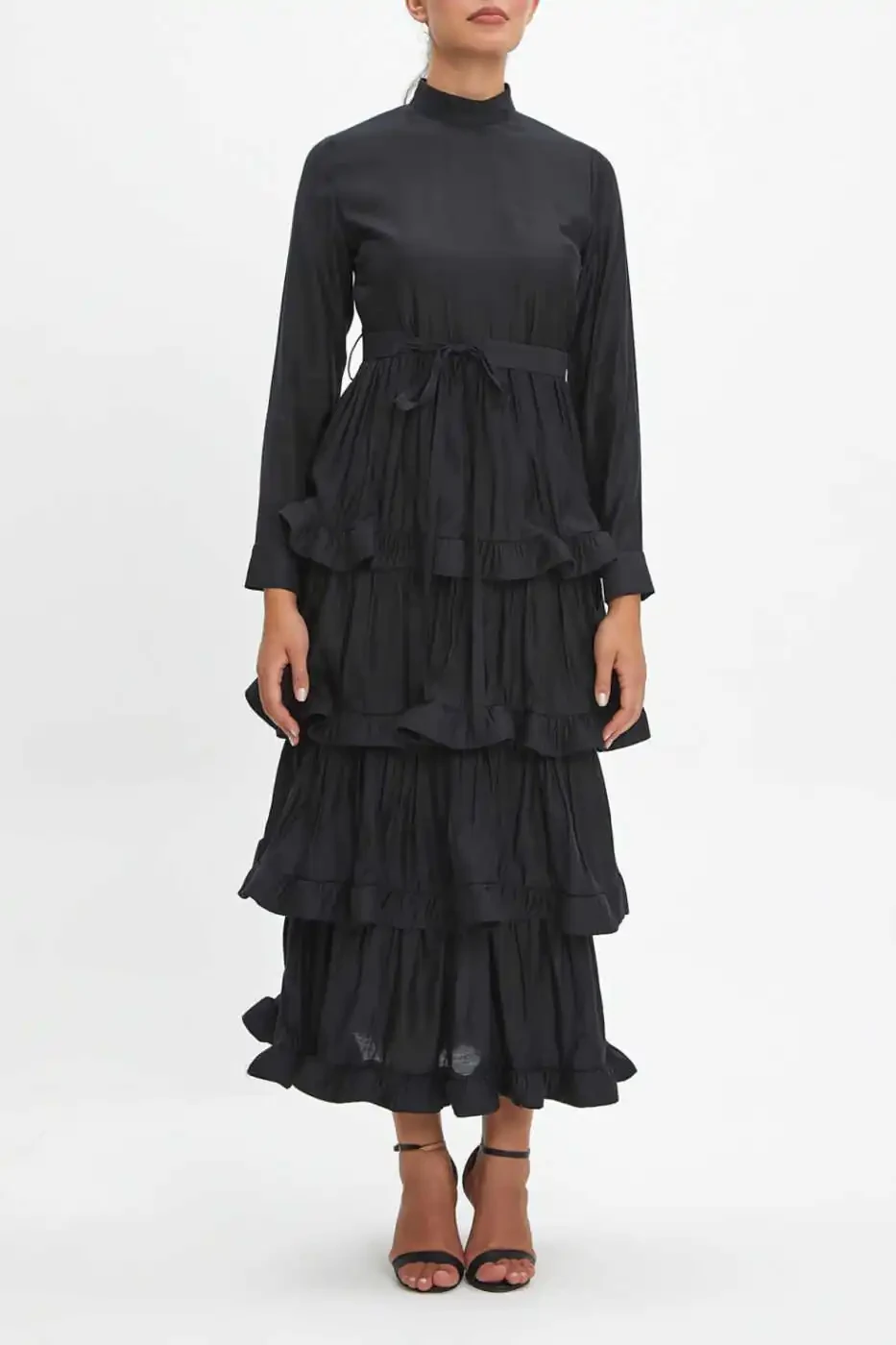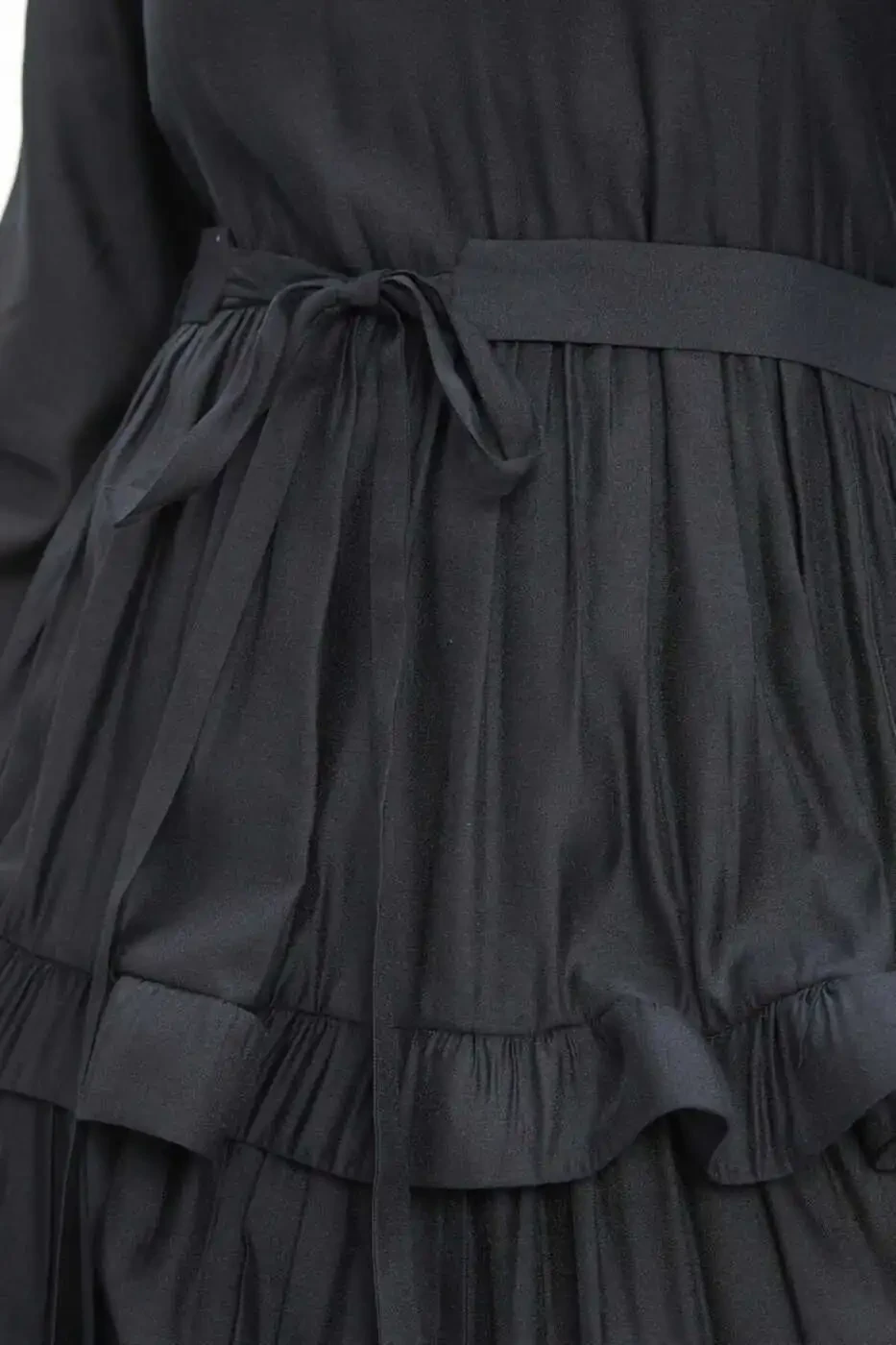 qora rangdagi ko'ylak, qavat qavat etak, jingalak ko'ylak, kamar bilan ko'ylak
