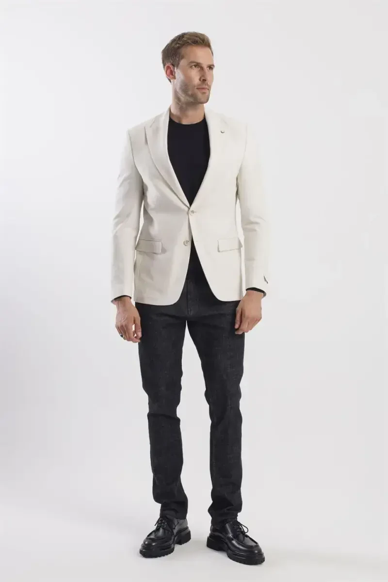 Krem rangli ingichka kesim naqshli oʻtkir yoqali pidjak: uslub va qulaylik