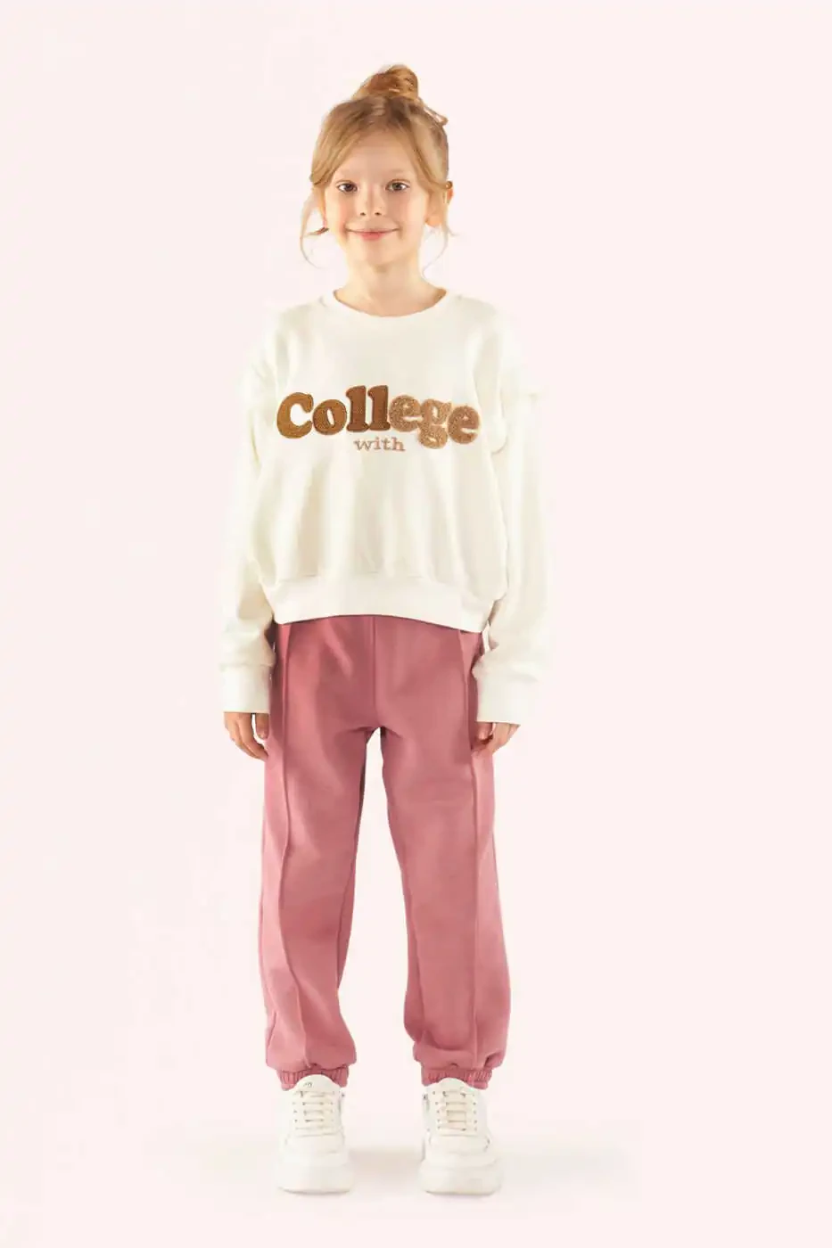 Qiz bola kashtasi bilan bezatilgan ekru svitshot | 100% paxta, uzun qisma va velosiped yoqali