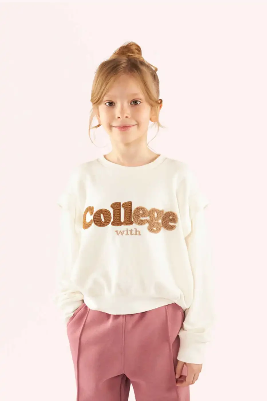 Qiz bolalar svitshoti, kashtali svitshot, ekru svitshot, paxtali svitshot, uzun yengli svitshot, velosiped yoqali svitshot, bolalar kiyimi, kundalik svitshot, yoqimli svitshot, qiz bolalar modasi