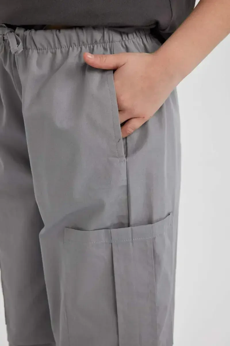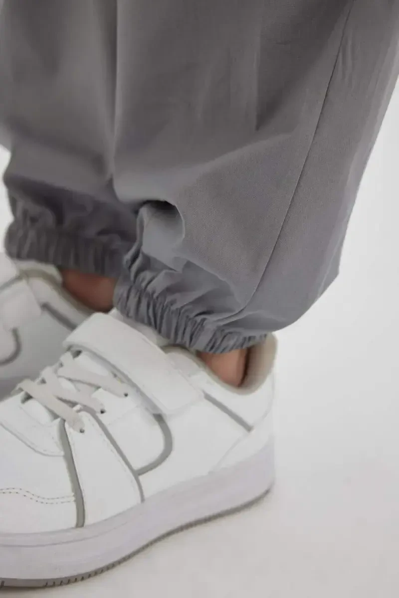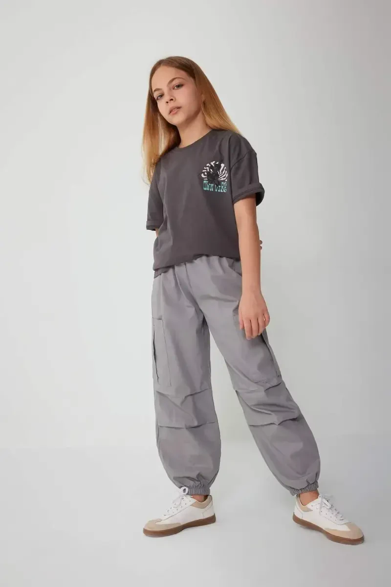 Kulrang rangli, paxta matosidan ishlab chiqarilgan, parashut kargo modelidagi qiz bolalar shim. Qulay bichimi va foydali cho'ntaklari bilan kundalik foydalanish uchun ideal.