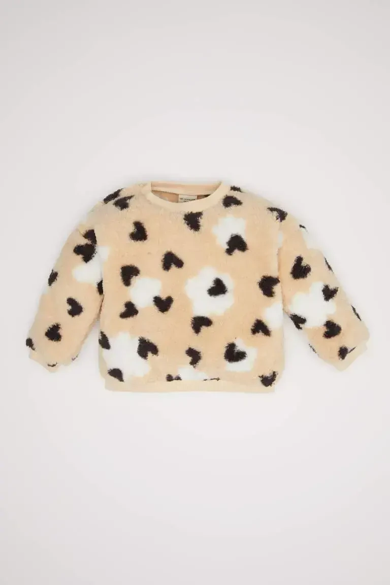 Qiz bola svitşort, velsoft plyush, yurak naqshli, velosiped yoqali, ichi tukli, Defacto, uzun yengli, regular fit, qum rangi, chaqaloqlar kiyimi