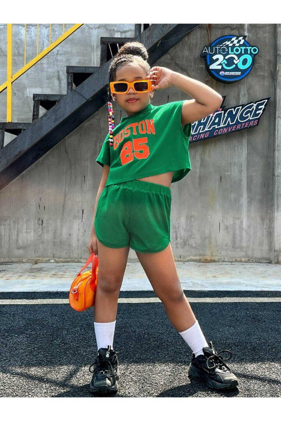Qiz bolalar uchun yashil rangli Boston25 bosma shorti va futbolka to'plami kundalik foydalanish uchun mukammal tanlovdir. O'yin maydonchasida, piknikda yoki do'stlari bilan vaqt o'tkazishda qizingiz bu zamonaviy va qulay to'plam bilan har doim zamonaviy va o'ziga ishongan holda ko'rinadi.
