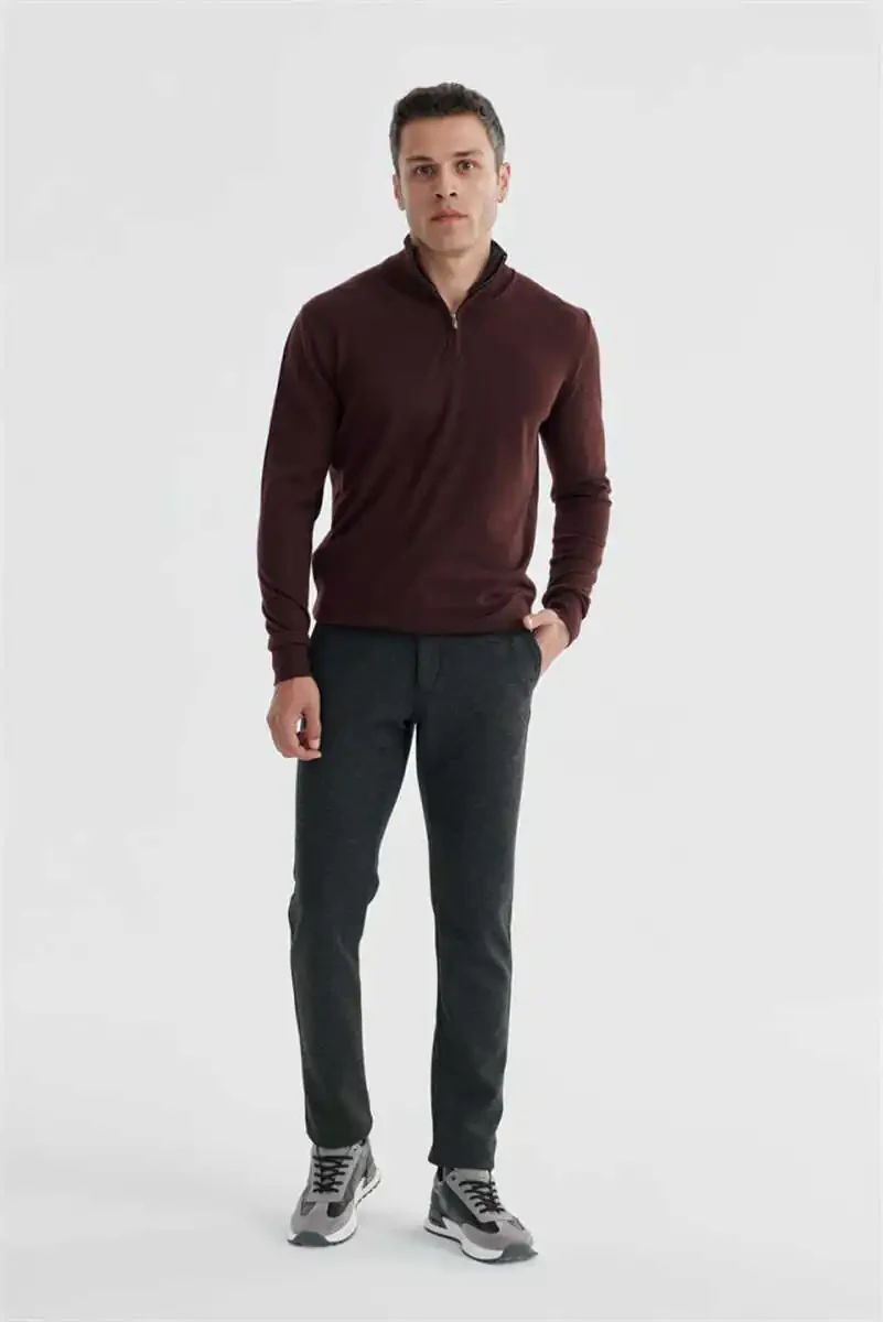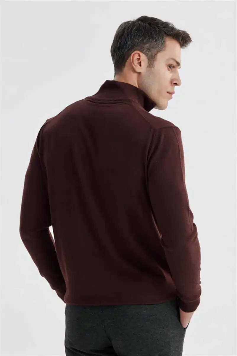 Burgundi slim fit triko kozok, baland yoqali, fermuarli, viskoza, poliamid, PBTM, kundalik foydalanish, maxsus kunlar
