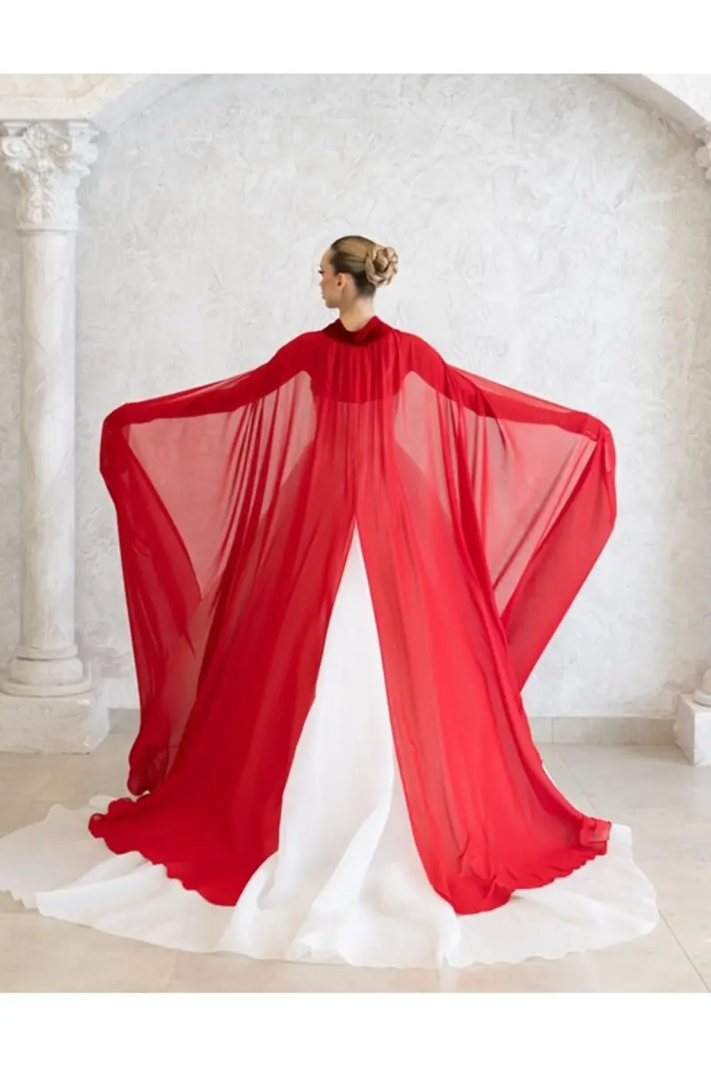 Qizil Shifon Kaftan - Kelinlik Ustki Pelerin - Bindallı - Shifon Kaftan - Qizil Xina Ko'ylak