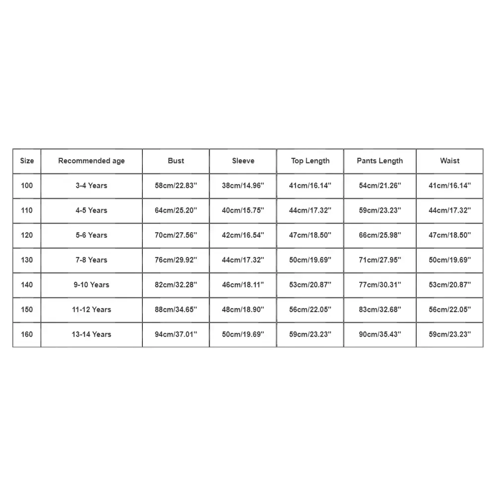 Iltimos, xarid qilishdan oldin o'lcham jadvalini diqqat bilan ko'rib chiqing va farzandingizning tanasiga eng mos keladiganini tanlang. O'lchamlar yoshga qarab farq qilishi mumkin, shuning uchun o'lchovlar muhimdir.O'lchamlar:100 O'lcham (3-4 yosh): Ko'krak: 58cm, Qo'l: 38cm, Ustki uzunlik: 41cm, Shim uzunligi: 54cm, Bel: 41cm110 O'lcham (4-5 yosh): Ko'krak: 64cm, Qo'l: 40cm, Ustki uzunlik: 44cm, Shim uzunligi: 59cm, Bel: 44cm120 O'lcham (5-6 yosh): Ko'krak: 70cm, Qo'l: 42cm, Ustki uzunlik: 47cm, Shim uzunligi: 66cm, Bel: 47cm130 O'lcham (7-8 yosh): Ko'krak: 76cm, Qo'l: 44cm, Ustki uzunlik: 50cm, Shim uzunligi: 71cm, Bel: 50cm140 O'lcham (9-10 yosh): Ko'krak: 82cm, Qo'l: 46cm, Ustki uzunlik: 53cm, Shim uzunligi: 77cm, Bel: 53cm150 O'lcham (11-12 yosh): Ko'krak: 88cm, Qo'l: 48cm, Ustki uzunlik: 56cm, Shim uzunligi: 83cm, Bel: 56cm160 O'lcham (13-14 yosh): Ko'krak: 94cm, Qo'l: 50cm, Ustki uzunlik: 59cm, Shim uzunligi: 90cm, Bel: 59cm. Bolalaringizning qulayligi va baxti uchun ehtiyotkorlik bilan ishlab chiqilgan.