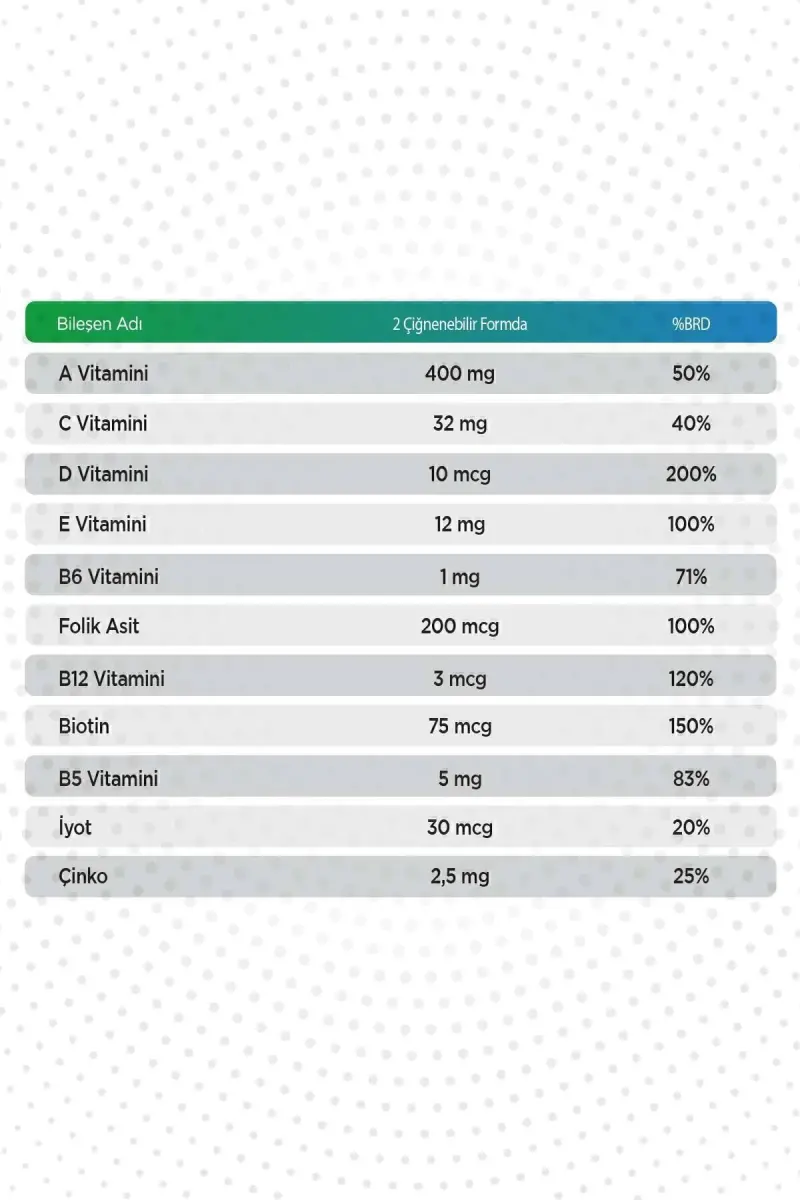 Shakar, makkajo'xori siropi, jelatin, limon kislotasi, tabiiy aromalar, ranglar (to'q sariq, binafsha, sariq), kaltsiy pantotenati, niasinamid, piridoksin gidroxloridi, tiamin mononitrati, riboflavin, folat kislotasi, biotin, siyanokobalamin, askorbin kislotasi, alfa-tokoferol asetati, retinol asetati, kaltsiy karbonat, temir fumarati, rux sulfati, magniy oksidi, mis sulfati, marganets sulfati, xrom xloridi, kaliy yodidi, selen metionini, molibden sulfati.