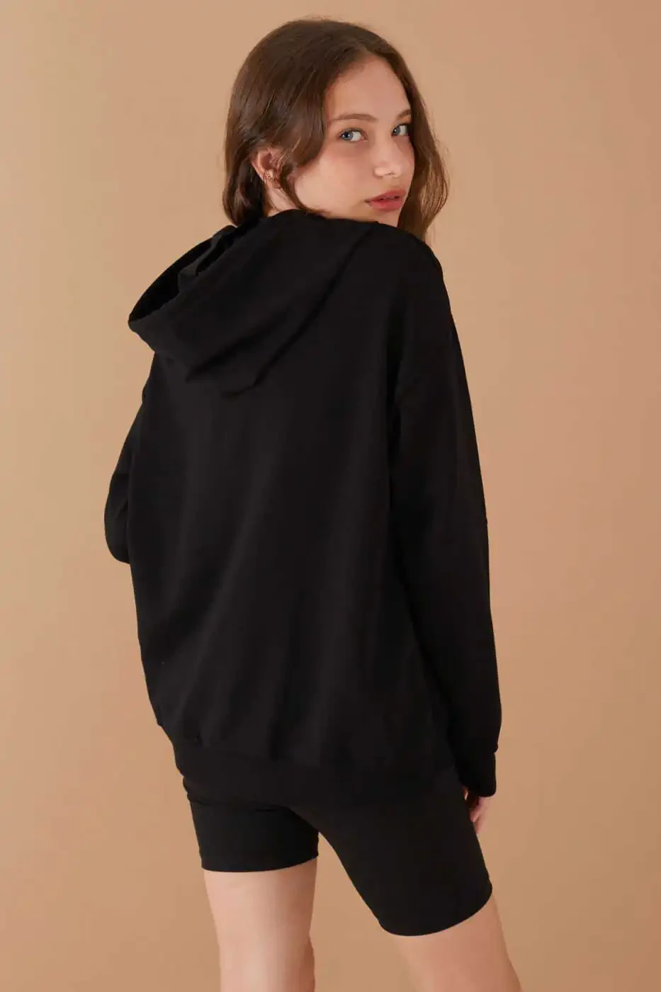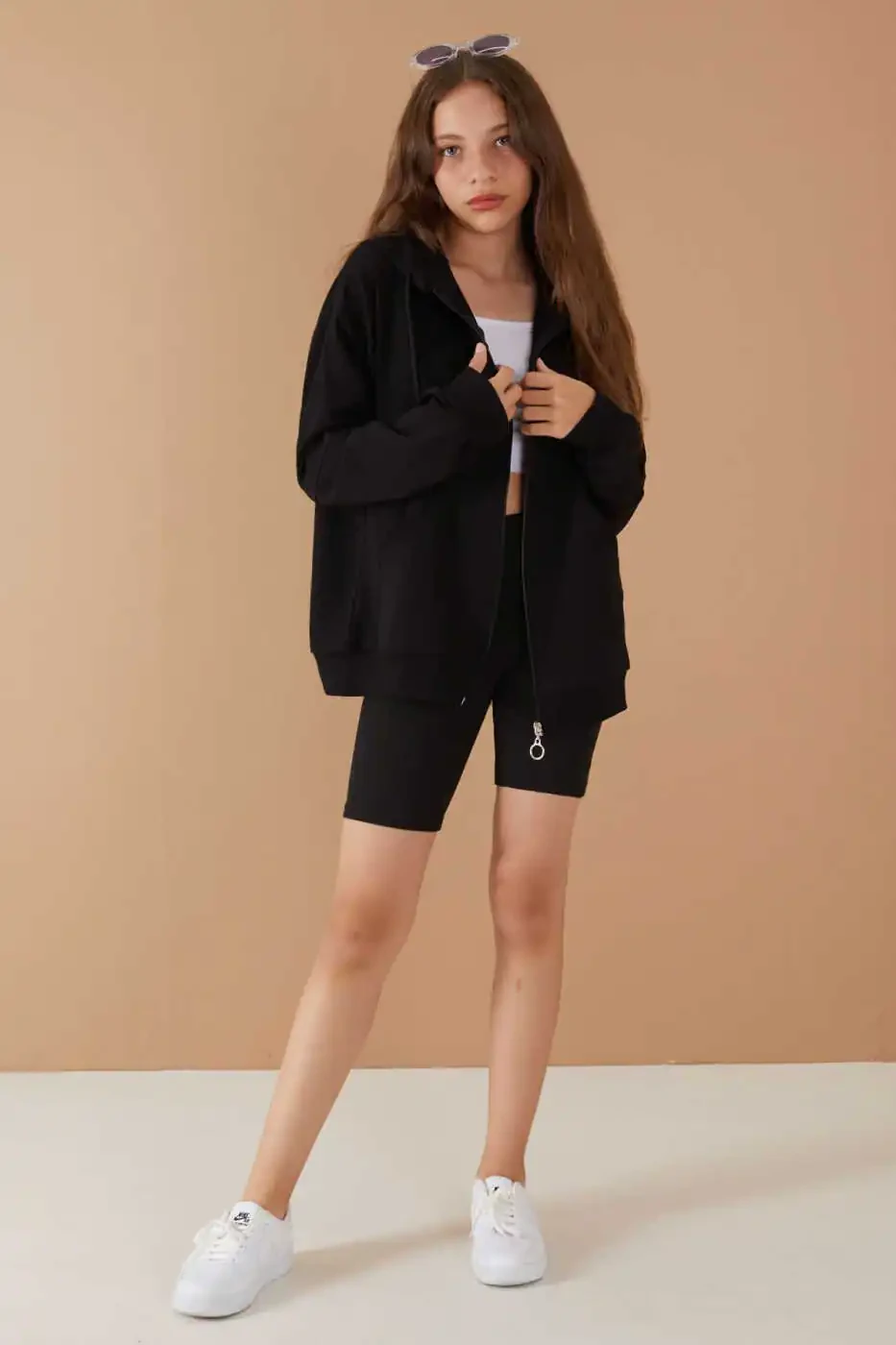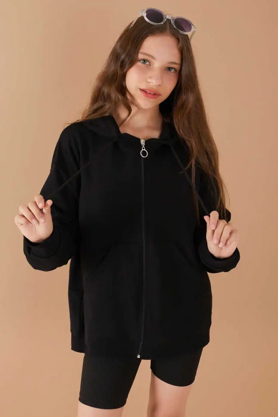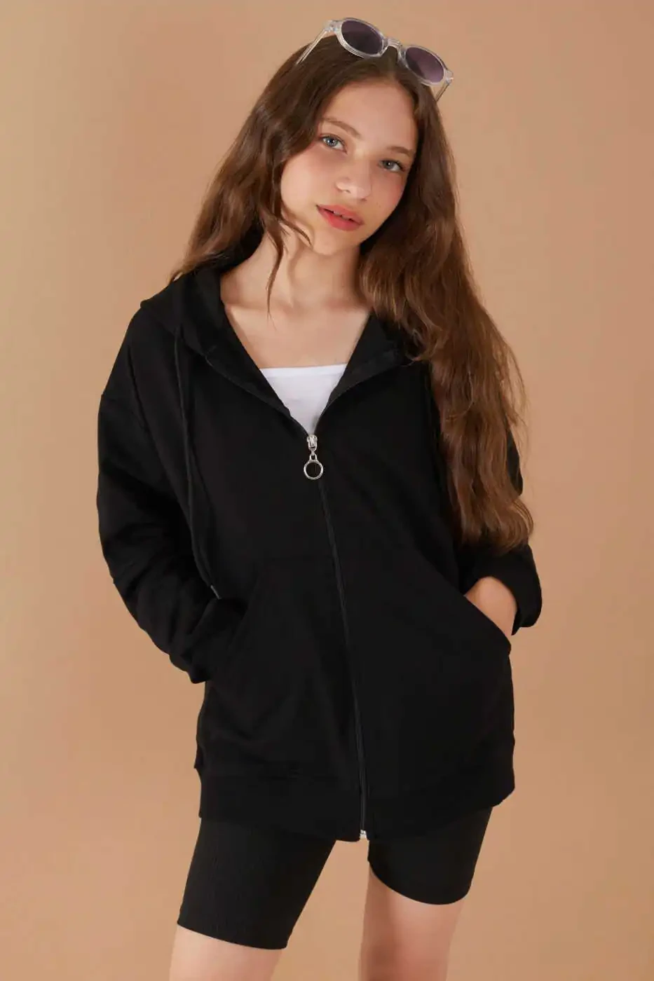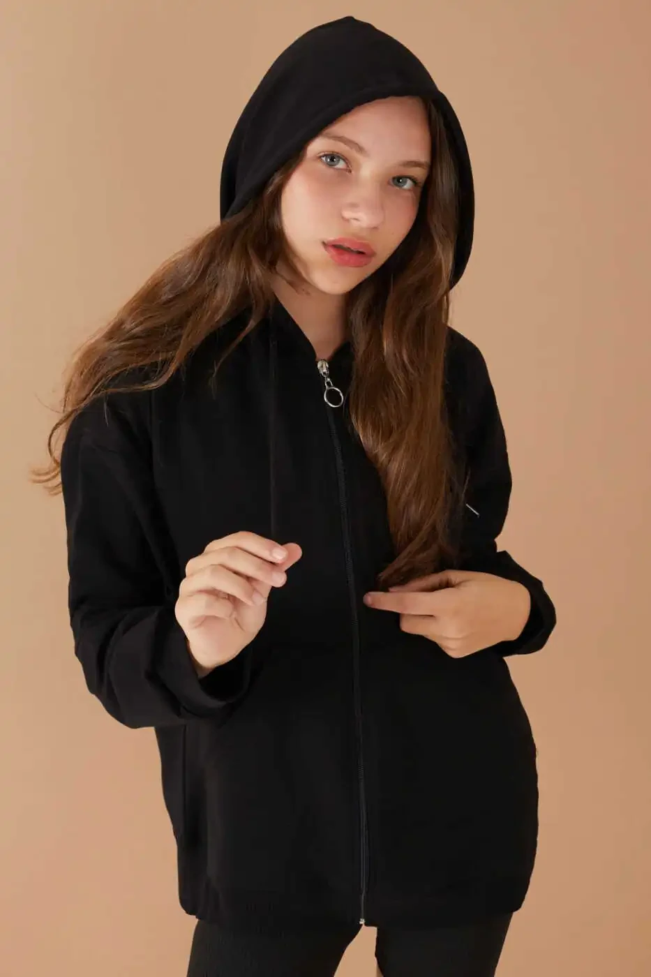 Qora Fermuarlı Oddiy Bolalar Qizlar Uchun Kapotli Maktab Kardigani - Stil va Qulaylik Birlashgan