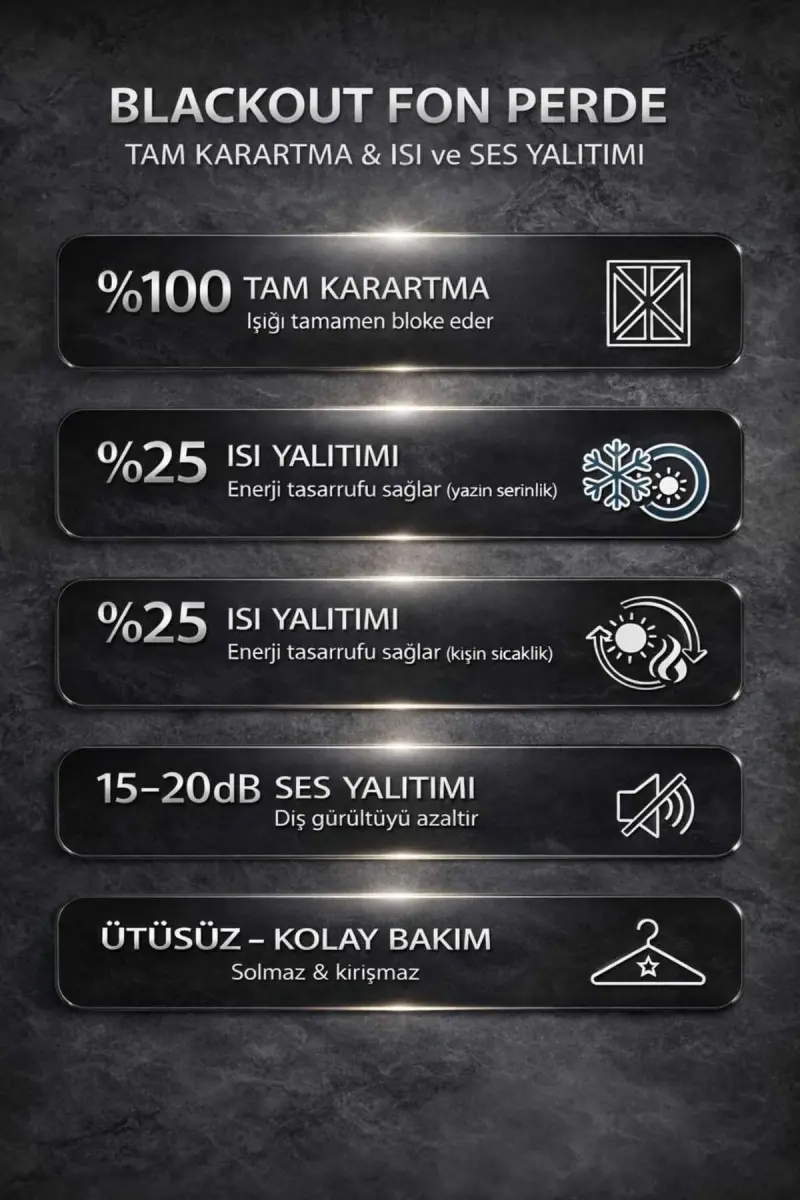 Termal tuzilishi tufayli yozda salqin, qishda esa iliq muhit ta'minlaydi. Ayniqsa, uyqu paytida quyosh nuridan bezovtalanuvchilar uchun ideal tanlovdir. Bundan tashqari, u sizga energiya tejashga ham yordam beradi. Quyosh nuri ichkariga kirishini to'sib qo'yganligi sababli, konditsioneringiz yoki isitgichingiz kamroq ishlaydi.