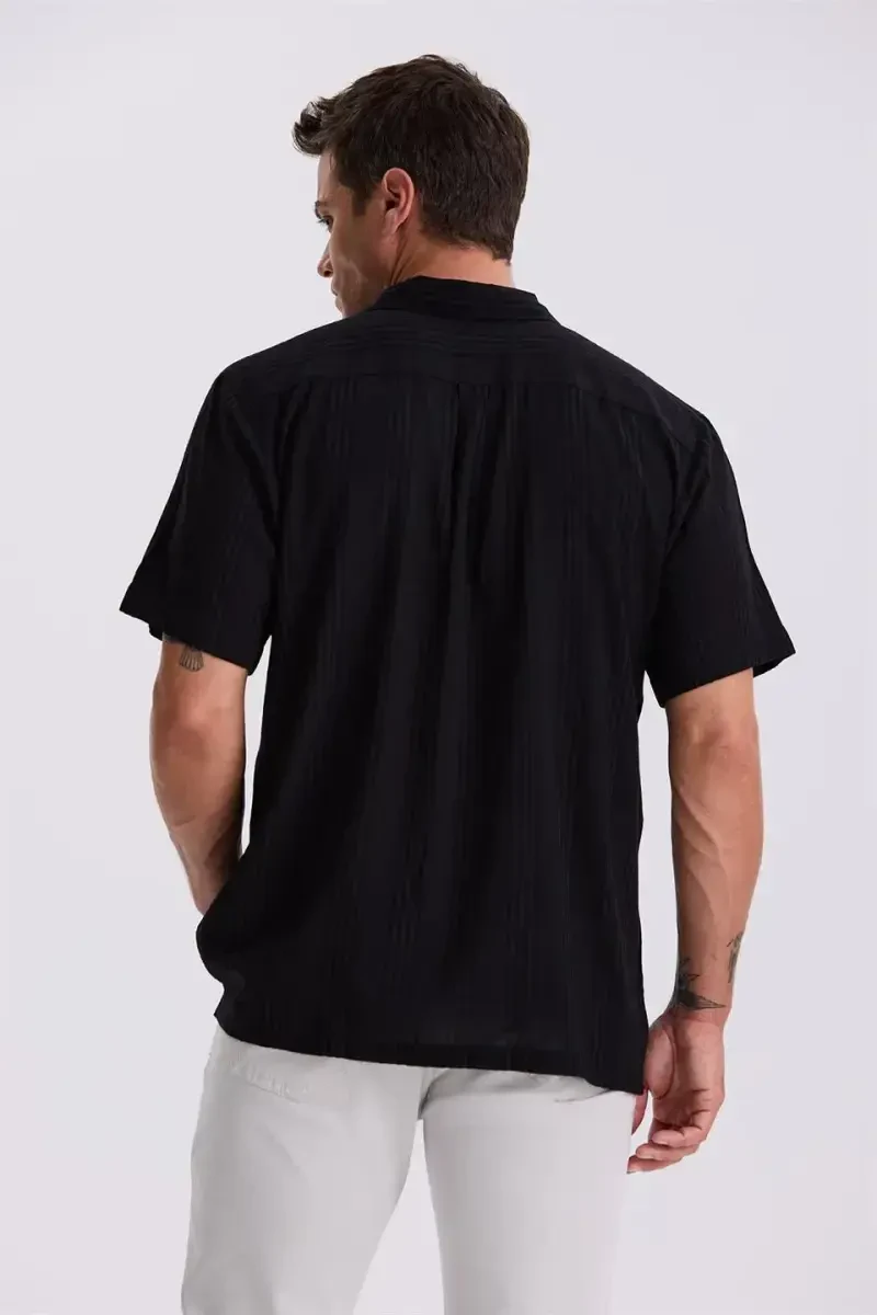 Qora Klassik Fit Apaş Yoqali Qulay Qisqa Qollu Ko'ylak | 70% Paxta, 30% Zig'ir