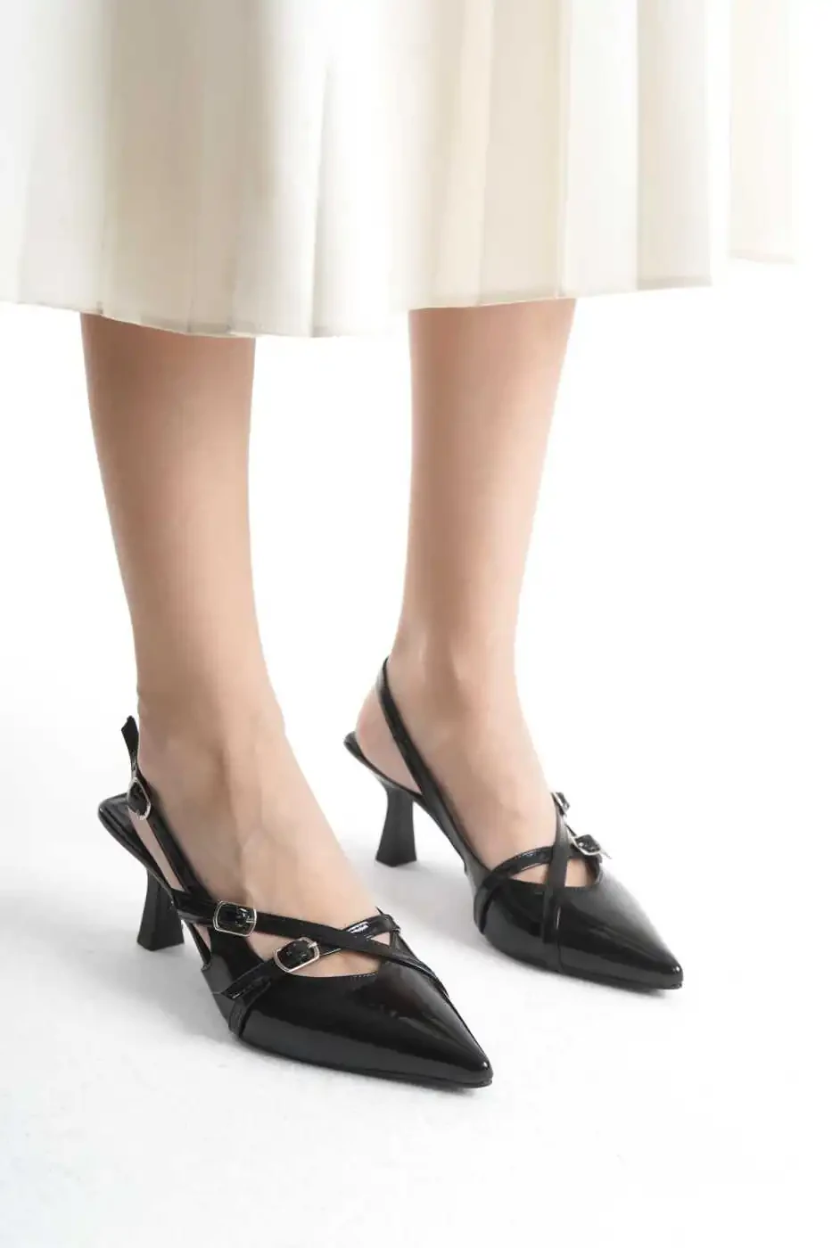 Nafislik va o'ziga xoslikni uyg'unlashtirgan bu qora lakli ayollar poyafzal, uchli buruni va diqqatga sazovor to'qima detali bilan har bir ayolning garderobida bo'lishi kerak bo'lgan narsadir. 7 sm poshnali uzun va nafis ko'rinishga ega bo'lib, poyafzal har qanday maxsus marosim, tungi chiqish yoki kundalik zamonaviy kombinatsiyalaringiz uchun ideal tanlovdir. Yuqori sifatli lakli materialdan tayyorlangan poyafzal oyoqlaringizda qulay foydalanishni ta'minlaydi, shu bilan birga zamonaviy va o'ziga xos ko'rinish bag'ishlaydi.
