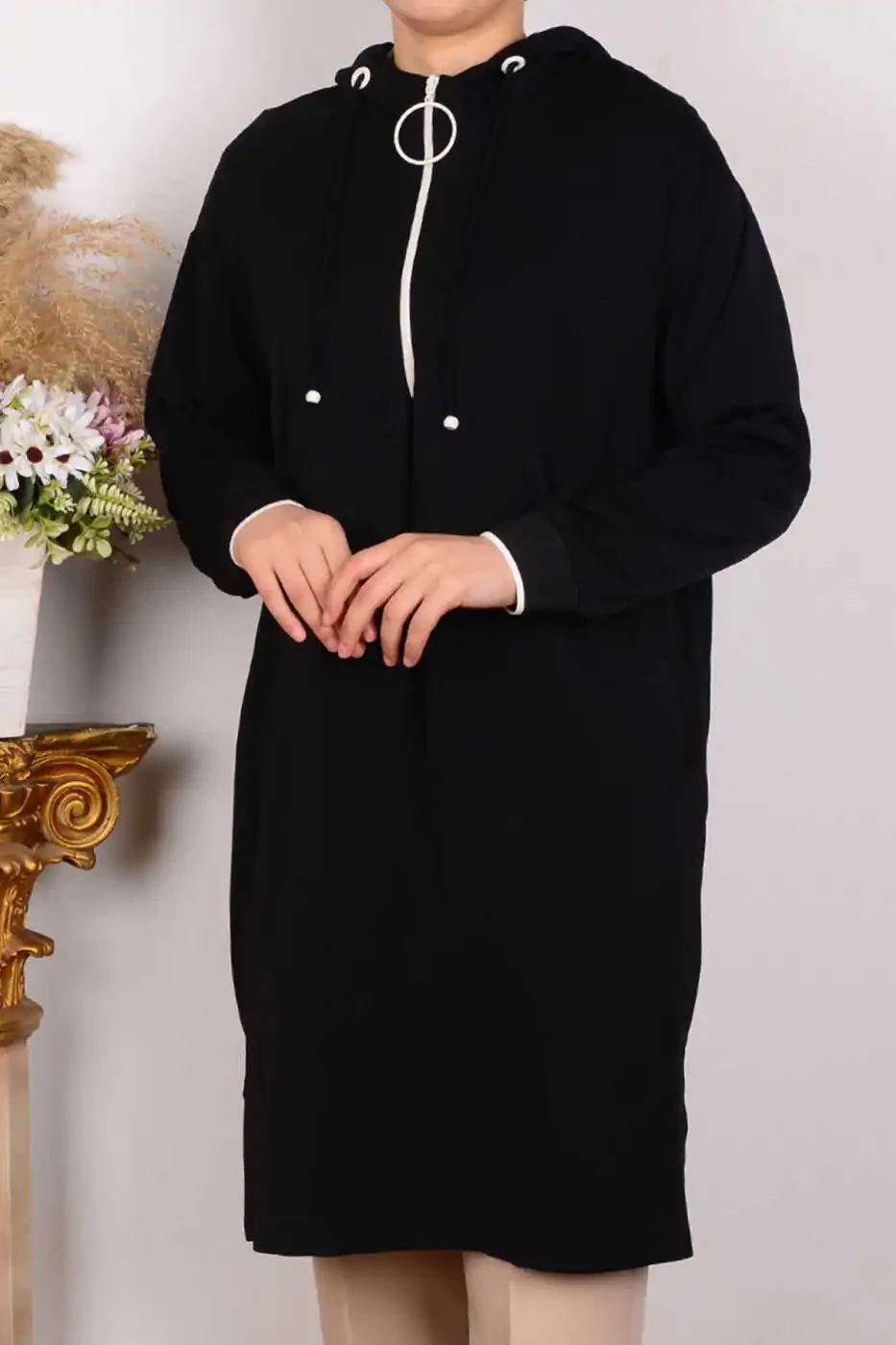 24yt461 qora rangli ayollar tunikasi - keng o'lchamli kaputli yarim fermuarli