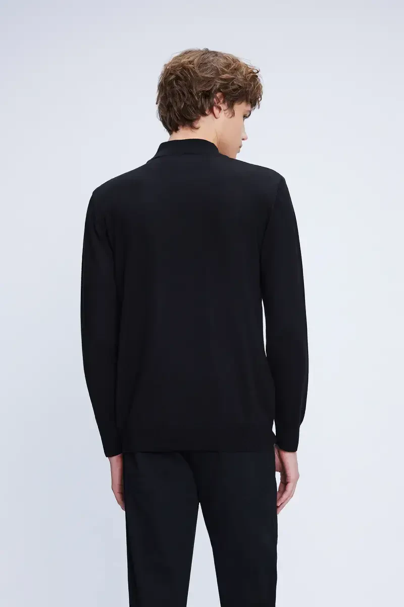 Qora triko, jun triko, yarim baland yoqali, regular fit, erkaklar trikosi, qishki triko, issiq saqlaydigan triko, chiroyli triko, kundalik triko, sifatli triko