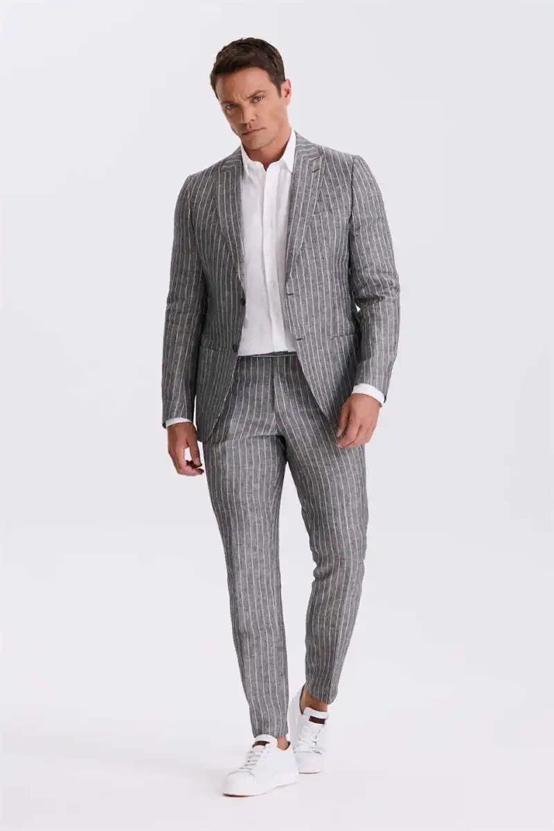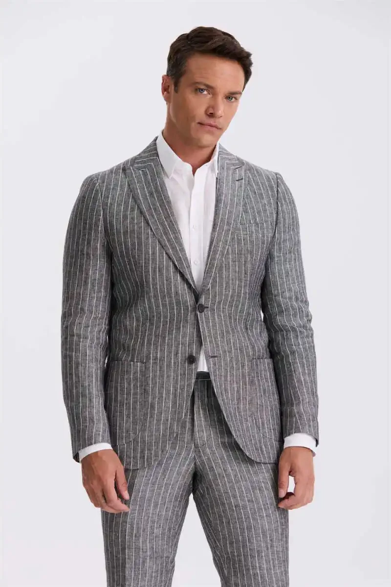 **Qora Slim Fit Qaldirgʻoch Yaxasimon Ikkita Yirtiq %100 Zigʻir Sport Kostyum****Material:**100% Zigʻir**Xususiyatlari:*** Uchli yoqa* Slim Fit* Ikkita yirtiq* Chiziqli naqsh* Yonboshi choʻntaklar**Oʻlchamlari:*** Model oʻlchamlari: * Boʻyi: 189 sm * Koʻkrak qafasi: 100 sm * Bel: 81 sm * Son: 97 sm* Model oʻlchami: 52**Asosiy xususiyatlari:*** Yengil va nafas oladigan mato* 100% tabiiy va atrof-muhitga zararsiz* Ommabop va zamonaviy dizayn* Har qanday tantanali kun va tadbirlar uchun mos* Kundalik kiyim sifatida ham qulaylik bilan foydalanish mumkin