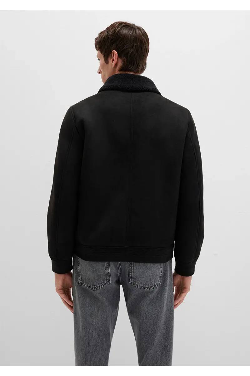 Qora sun'iy charm terisi kurtkasi, oddiy kesish.