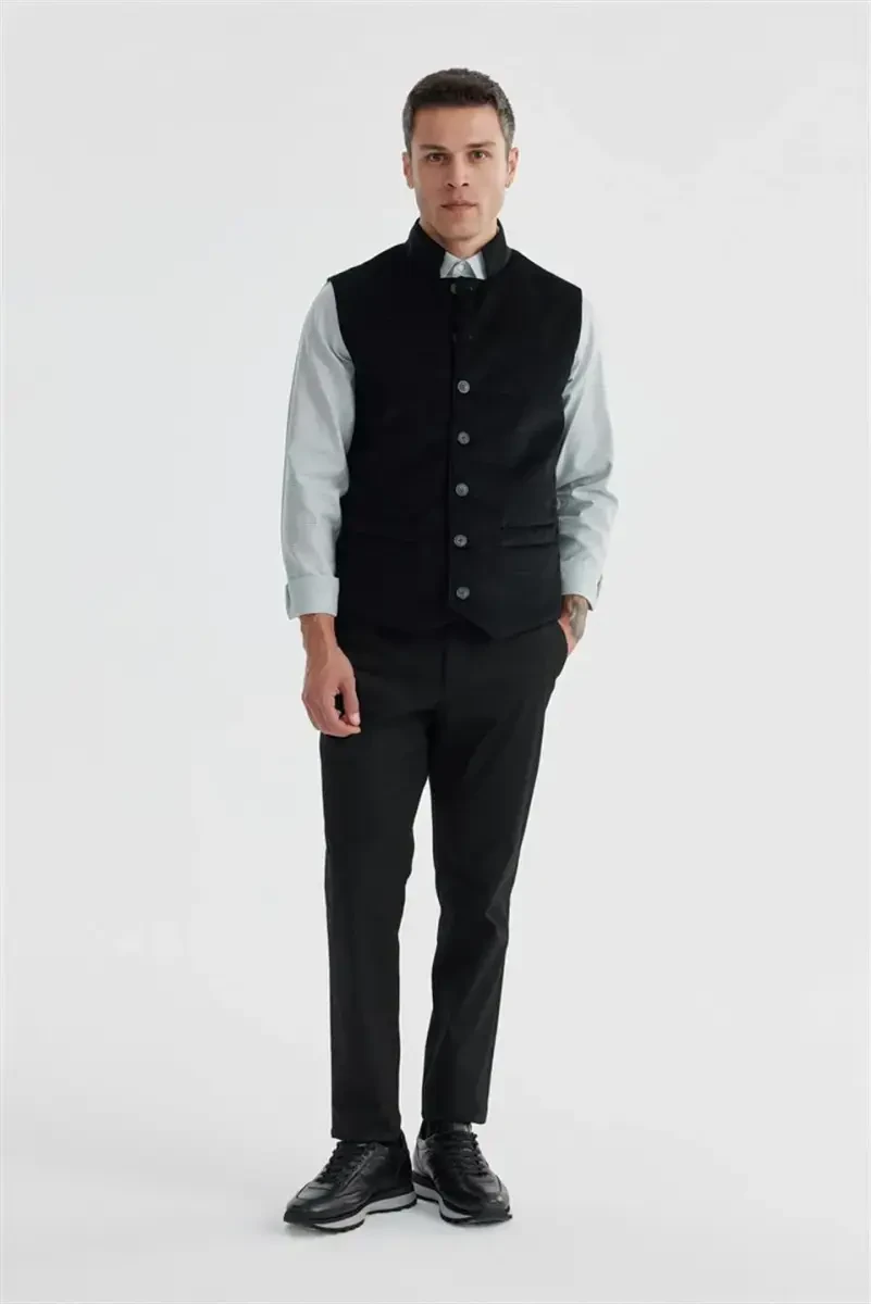 Qora Hakim Yoqali Jilet, Ikkita Tomonlama Jilet, Slim Fit Jilet, 100% Paxta Jilet