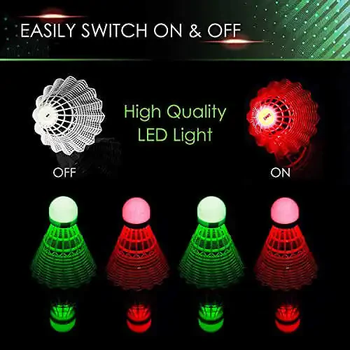 Bu 4 dona badminton to'plari, tunda badminton o'ynash uchun mukammal tanlov bo'lib, qorong'ida porlaydigan maxsus dizaynga ega. Maxsus materiallar bilan jihozlangan bu to'plar, ochiq havoda o'yinlaringiz uchun ajoyib vizual ziyofat taqdim etadi. Kechki o'yinlarda yaxshiroq ko'rinishni ta'minlaydigan bu to'plar, o'yinlaringizni yanada qiziqarli va hayajonli qiladi. Bundan tashqari, bardoshli tuzilishi tufayli uzoq muddatli foydalanishni ta'minlaydi.