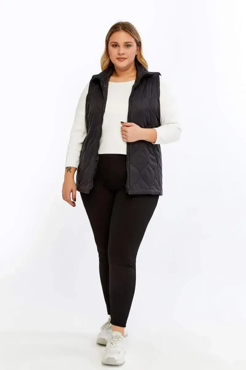 Discover the Quilted Plus Size Vest in Black, a must-have for autumn and winter, ensuring you stay warm without compromising your style. This vest is specially designed for plus-size women, offering both comfort and a modern look. Made from 100% polyester woven fabric, it enhances the vest's durability while maintaining its lightness. This allows you to enjoy a comfortable wearing experience all day long without feeling weighed down.The quilted pattern not only adds visual richness to the vest but also helps evenly distribute the inner filling, optimizing heat insulation. The elegance of the black color allows you to easily combine the vest with different outfits. Whether you combine it with jeans and a t-shirt for a casual look or with a blouse and skirt for a more elegant look, the Quilted Plus Size Vest in Black is always a piece that will complete your style.The model's measurements (Height: 1.78 - Bust: 103 - Waist: 89 - Hips: 110) and the size 44 vest she is wearing demonstrate how well the product fits plus-size figures. The 80 cm length offers both a modern look and keeps your body sufficiently warm. The practical use and stylish design of the vest will make it an indispensable part of your wardrobe. It is an ideal choice for those who want to look stylish and stay warm in cold weather. Complete your style with the Quilted Plus Size Vest in Black and enjoy comfort and elegance.