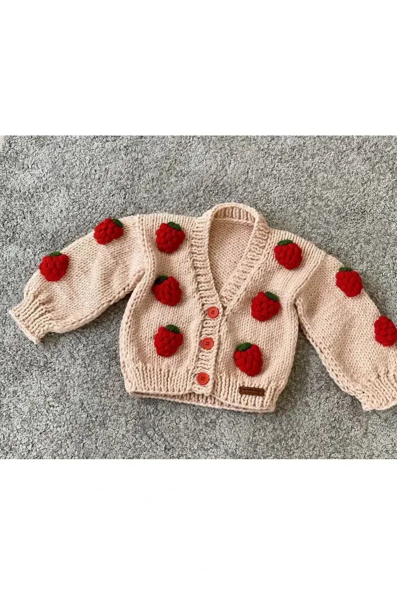 Qo'lda to'qilgan qulupnay detallari bilan akril kardigan