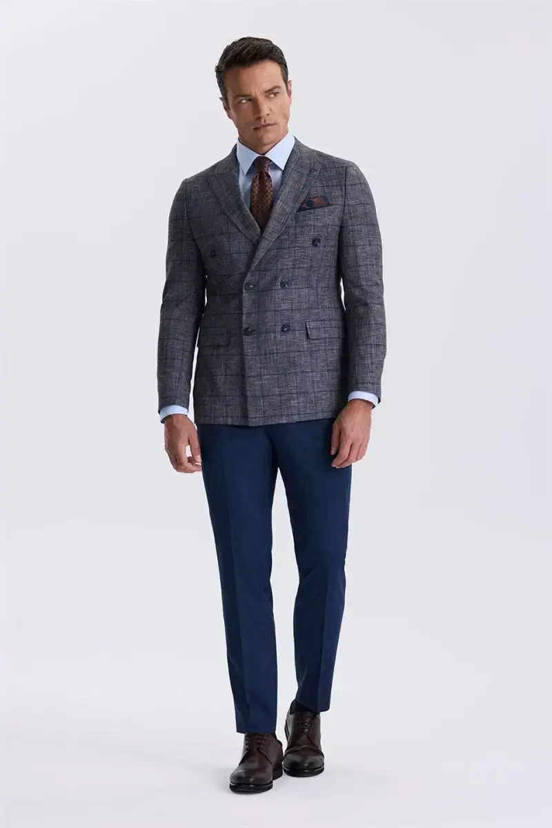 To'q ko'k ingichka kesimli qaldirg'ochli yevropa bo'yinbog'li katakli birlashgan kostyum