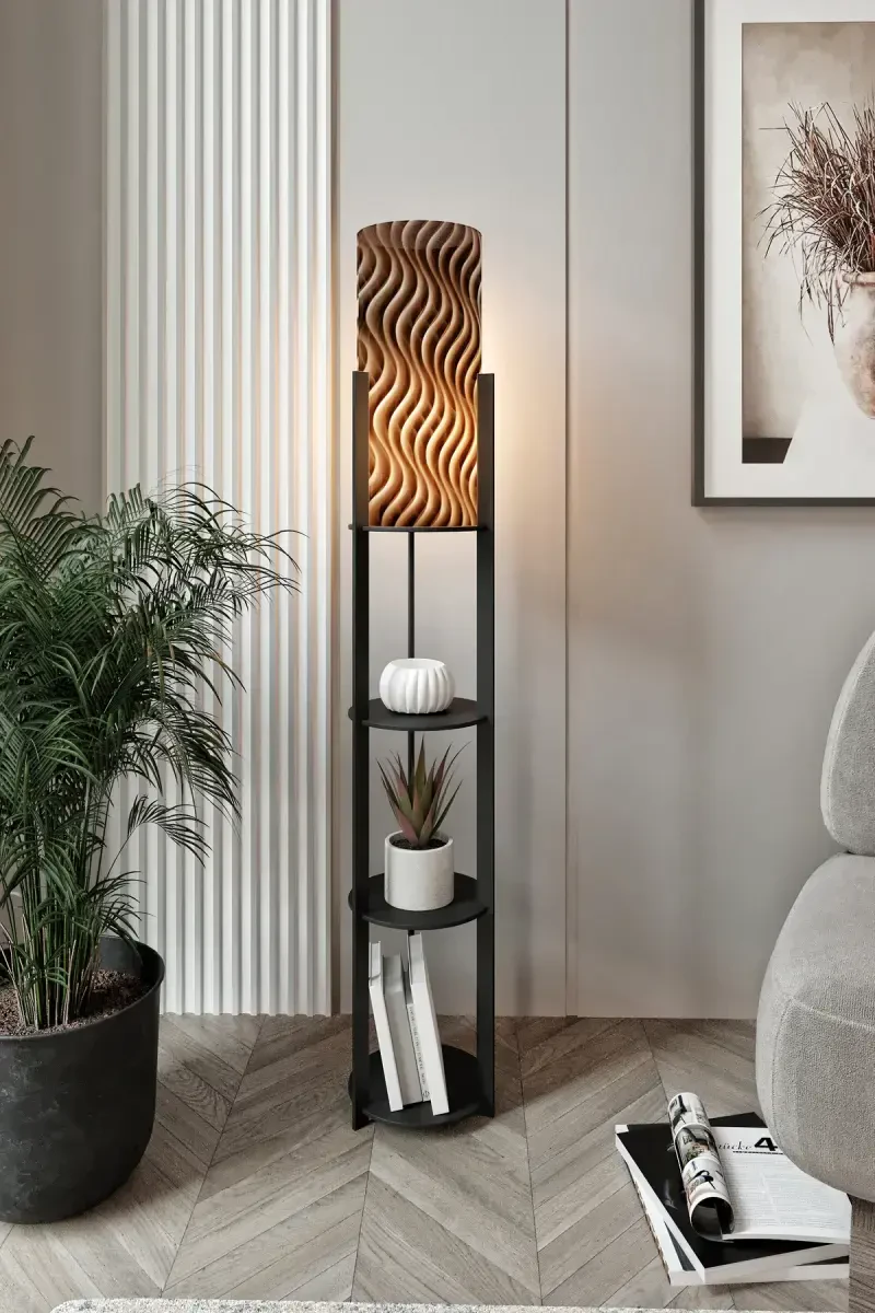 Radiante Round Shelved Floor Lamp Sapphire Oak-Latte Coffee Gouache is a unique design product that will add warmth and elegance to your home. Produced with Messer Home Style quality, this floor lamp both meets your lighting needs and offers functionality to your living spaces with its decorative shelves. The sapphire oak and latte coffee gouache colors of the product easily adapt to modern and classic decoration styles. The delicately crafted round shelves are ideal for displaying your books, plants or other decorative objects.Messer Shelved Floor Lamp is produced using 1st class MDF in European Union standards. It does not contain any carcinogenic substances harmful to health. The profiles of the product are also made of MDF of the same quality, thus offering a long-lasting and durable use. Lower quality materials such as chipboard have not been used, which increases the quality and value of the product.The installation of the floor lamp is extremely easy. You can access the installation diagram by scanning the QR code in the box. You can easily assemble it without the need for any hand tools for installation. In this way, you can save time and start enjoying your new floor lamp.Radiante Floor Lamp also meets your expectations in terms of lighting. Thanks to the E27 socket type, you can use max 20W energy saving or LED bulbs. Thanks to its 2.00 meter long cable and the on-off switch on it, you can easily place the floor lamp wherever you want and control it easily. Bristol printed lampshade foil creates a warm atmosphere by spreading a soft and pleasant light to the environment.Radiante Round Shelved Floor Lamp is not just a lighting product, but also a stylish decorative object that adds value to your home. Thanks to its functional shelves, quality material and easy installation, it is a product that you can enjoy for many years.