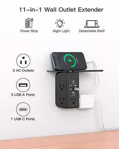 Devor rozetkasi kengaytirgichi, javon va tungi chiroq, ortiqcha oqimdan himoya, 5 ta USB chiqishi va 3 ta USB porti, 1 ta USB C chiqishi bilan USB devor zaryadlovchi qurilmasi