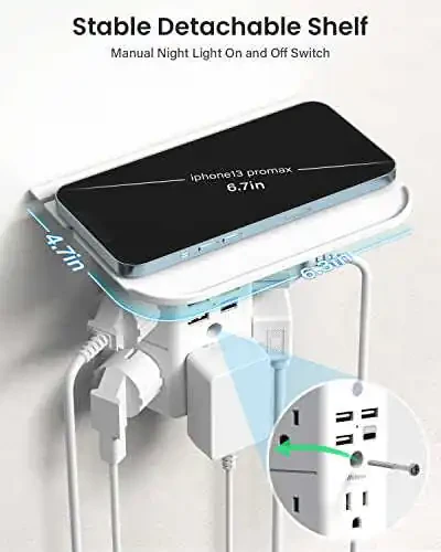 devor rozetkasi kengaytiruvchi, raf, tungi chiroq, 5 ta ac rozetkasi, 3 ta usb porti, 1 ta usb-c porti, kuchlanishdan himoya qilish, ko'p rozetka, elektr rozetkasi