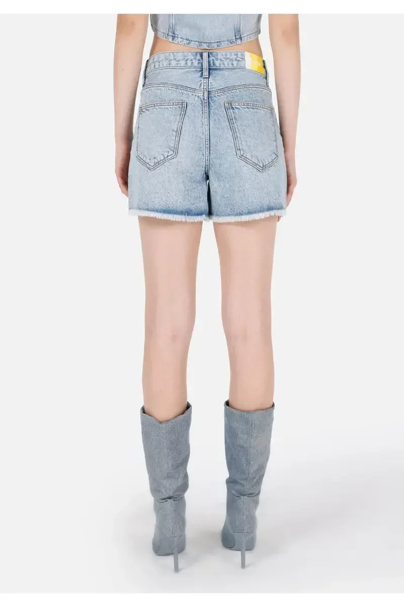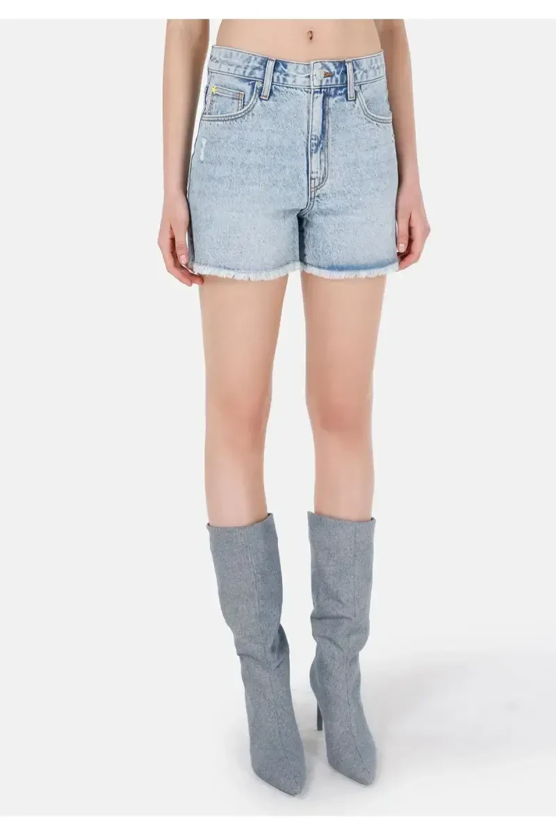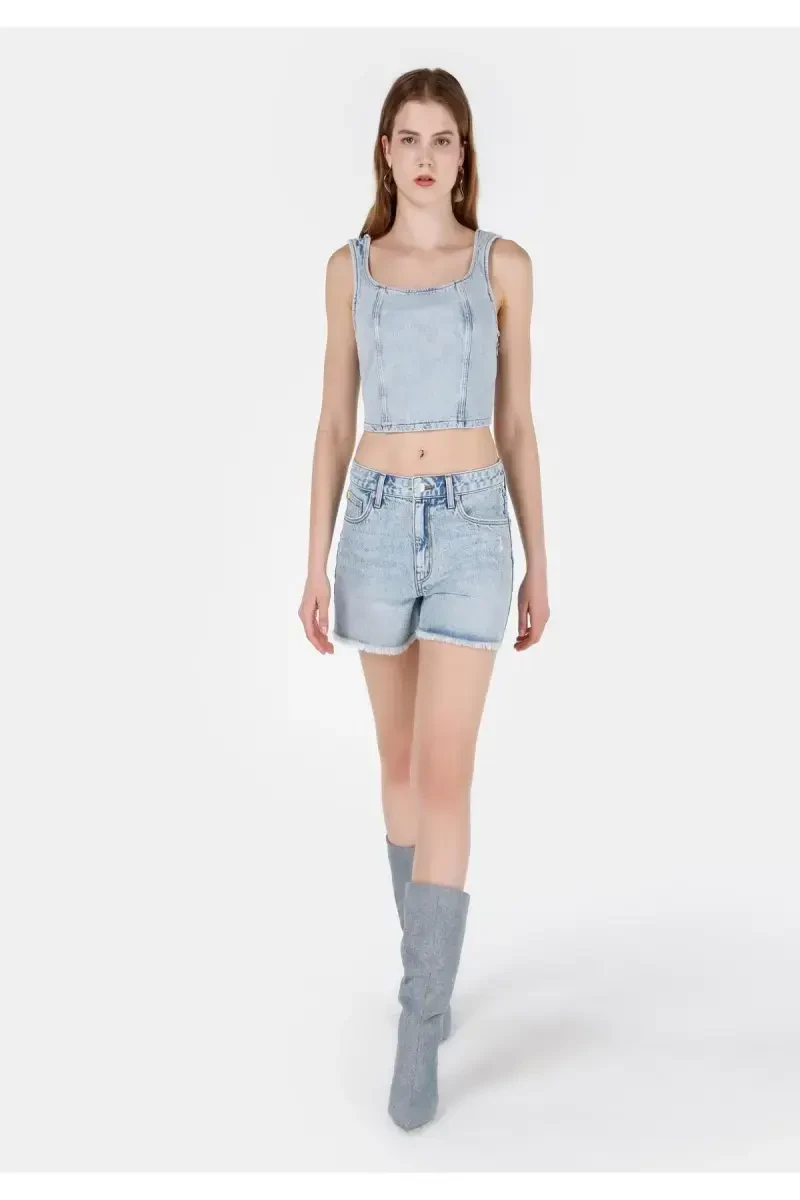 Yengil kesilgan, baland belli ko'k ayollar jin's shortilari.