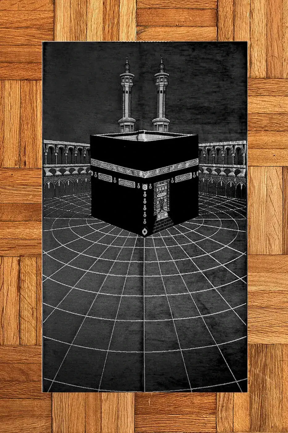 **Raqamli Chop Etilgan, Yuvilishi Mumkin Kaʼba Motifli Namazlik Gilamcha Sajjada 70x130, Seccade-48-qora**