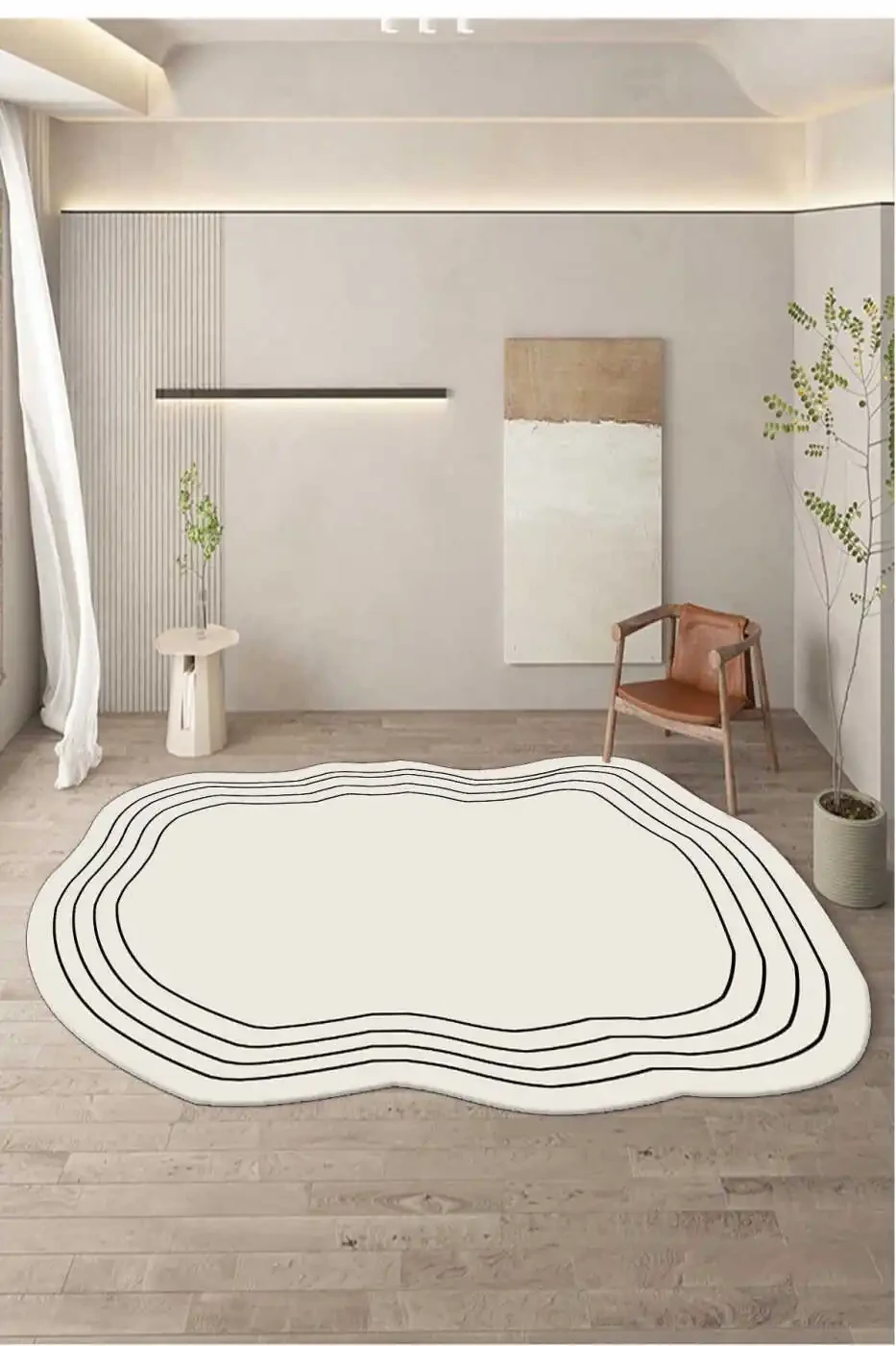 Bu noyob gilam nafis ko'rinish beruvchi assimetrik kesimi va zamonaviylikni aks ettiruvchi minimalist qora chiziqlar bilan bezatilgan oq dizayni bilan ajralib turadi. Uyingizning har bir burchagiga nafislik qo'shadi va dekorga mukammal to'ldiruvchi sifatida xizmat qiladi.