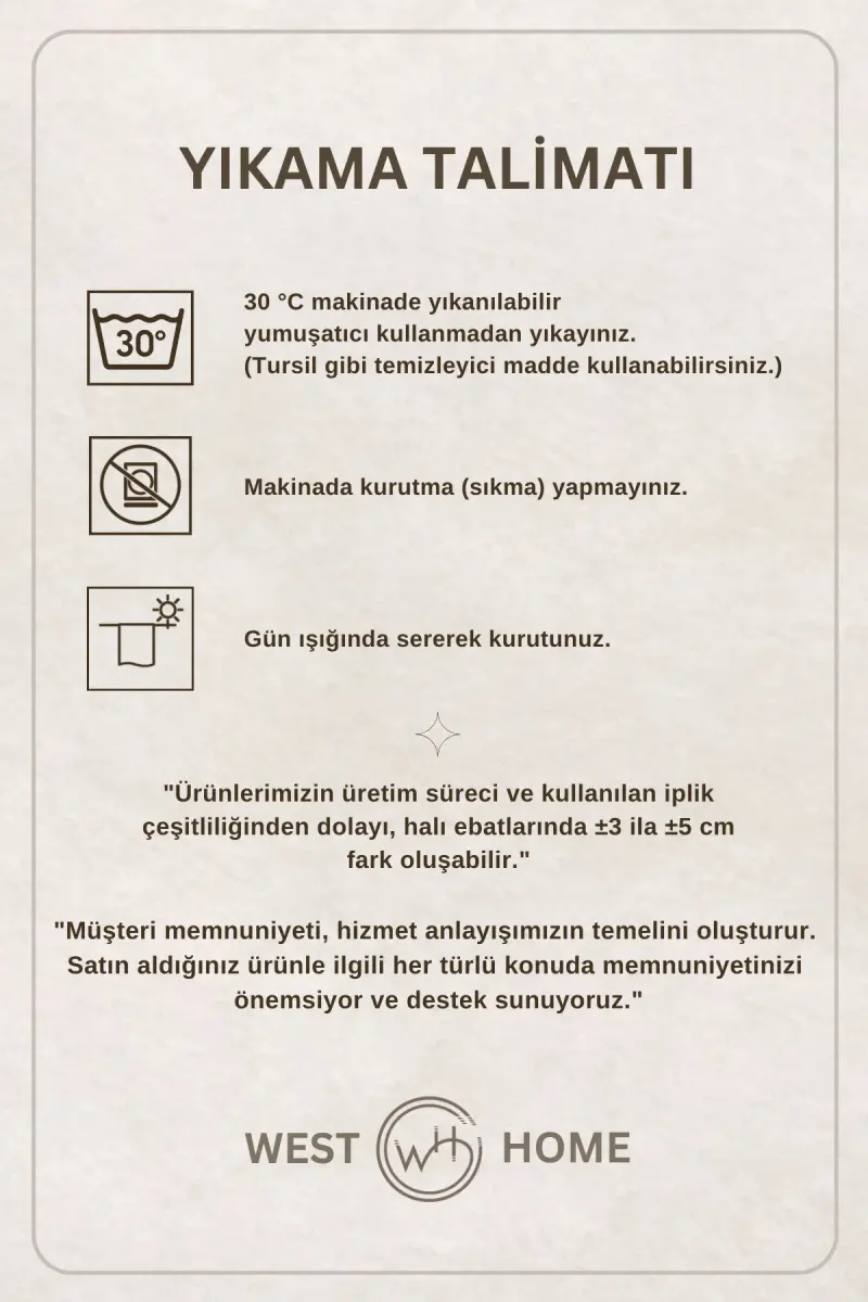 Ushbu mahsulot West Home tomonidan yuboriladi. 100 dan ortiq dona sotish uchun taklif qilingan. Siz ko‘rib chiqayotgan mahsulotning sotish narxi sotuvchi tomonidan belgilanadi. Mahsulotimiz bepul qaytarish huquqiga ega. WEST HOME SIFATIDAGI MAHSULOT XUSUSIYATLARI O‘lchovni tanlashda siz foydalanadigan maydonni kenglik va uzunlik sifatida metr yordamida o‘lchang (BIZNING O‘LCHOVLARIMIZ KENGLIK X UZUNLIK SHAKLIDA). Bizning barcha naqshlarimiz TPE tomonidan ro‘yxatdan o‘tkazilgan. Mahsulotlarimizning hammasi bir xil sifatda ishlab chiqarilgan. Lateks Pvc Dot taglik. Baxmal, ipaksimon to‘qima. Jun balandligi 0,8mm. Antistatik, antigipoallergen, antibakterial. Og‘ir va qiyin tozalanadigan gilamlardan emas.Yangi avlod zamonaviy gilam (raqamli bosilgan). Foydalanish bo‘yicha ko‘rsatma Sıkishsiz, kir yuvish mashinasi bilan 30° da yuvilishi mumkin. Tabiatga va inson sog‘lig‘iga zararli moddalarni o‘z ichiga olmaydi. Kanserojen moddalarni o‘z ichiga olmaydi. Toz chiqarmaydi, havo chiqarmaydi. 4 faslda foydalanish mumkin. Issiqlik izolyatsiyasi xususiyatiga ega. Chang va dog‘ga chidamli. Oson tozalanadi.