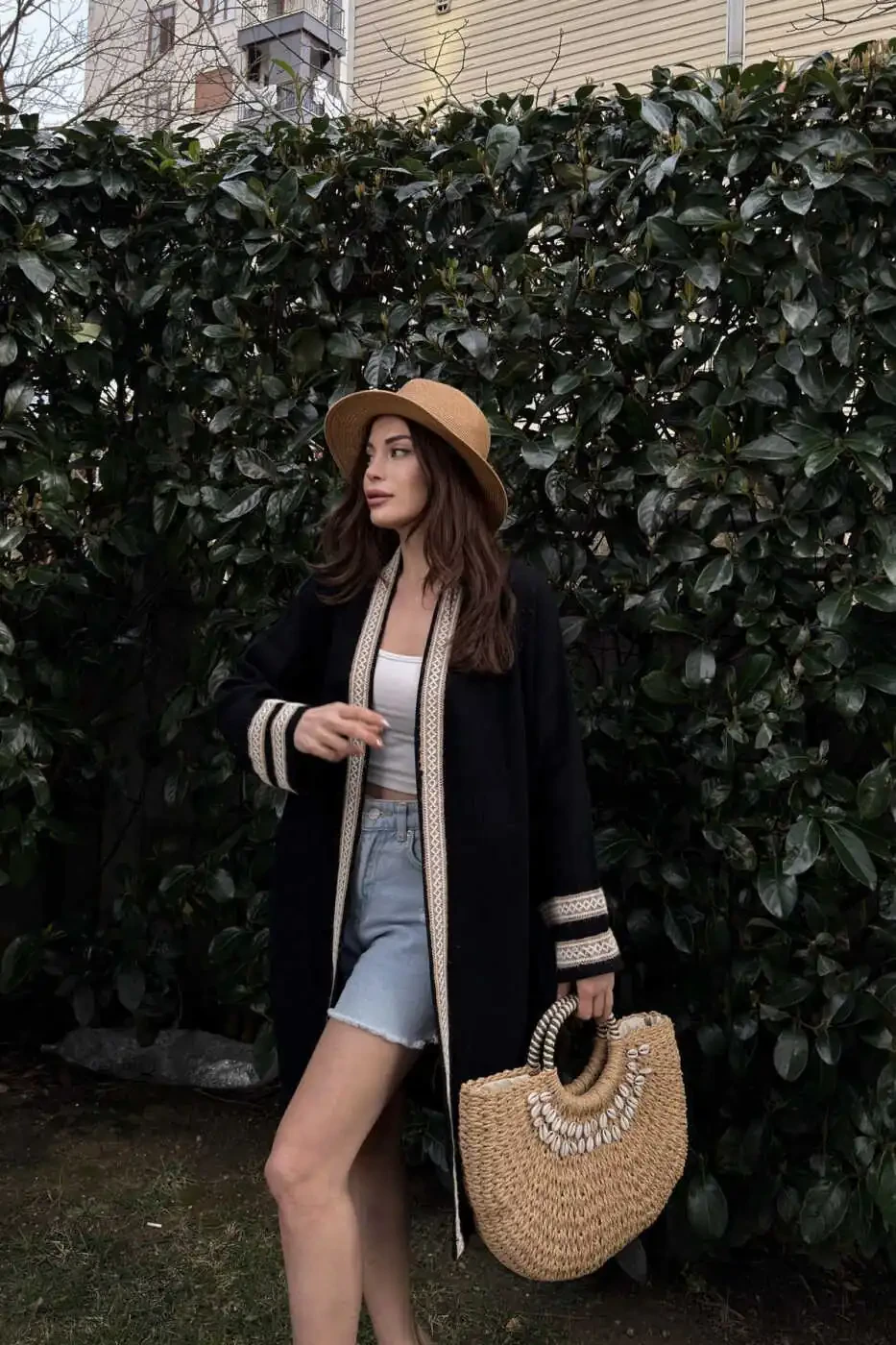 Этот свободный жакет-кимоно, сочетающий в себе стиль и комфорт, станет незаменимой частью вашего гардероба! Изготовленный из легкой и дышащей муслиновой ткани, жакет позволяет вам оставаться прохладным в летнюю жару. Детали из рафии придают жакету стильный вид.