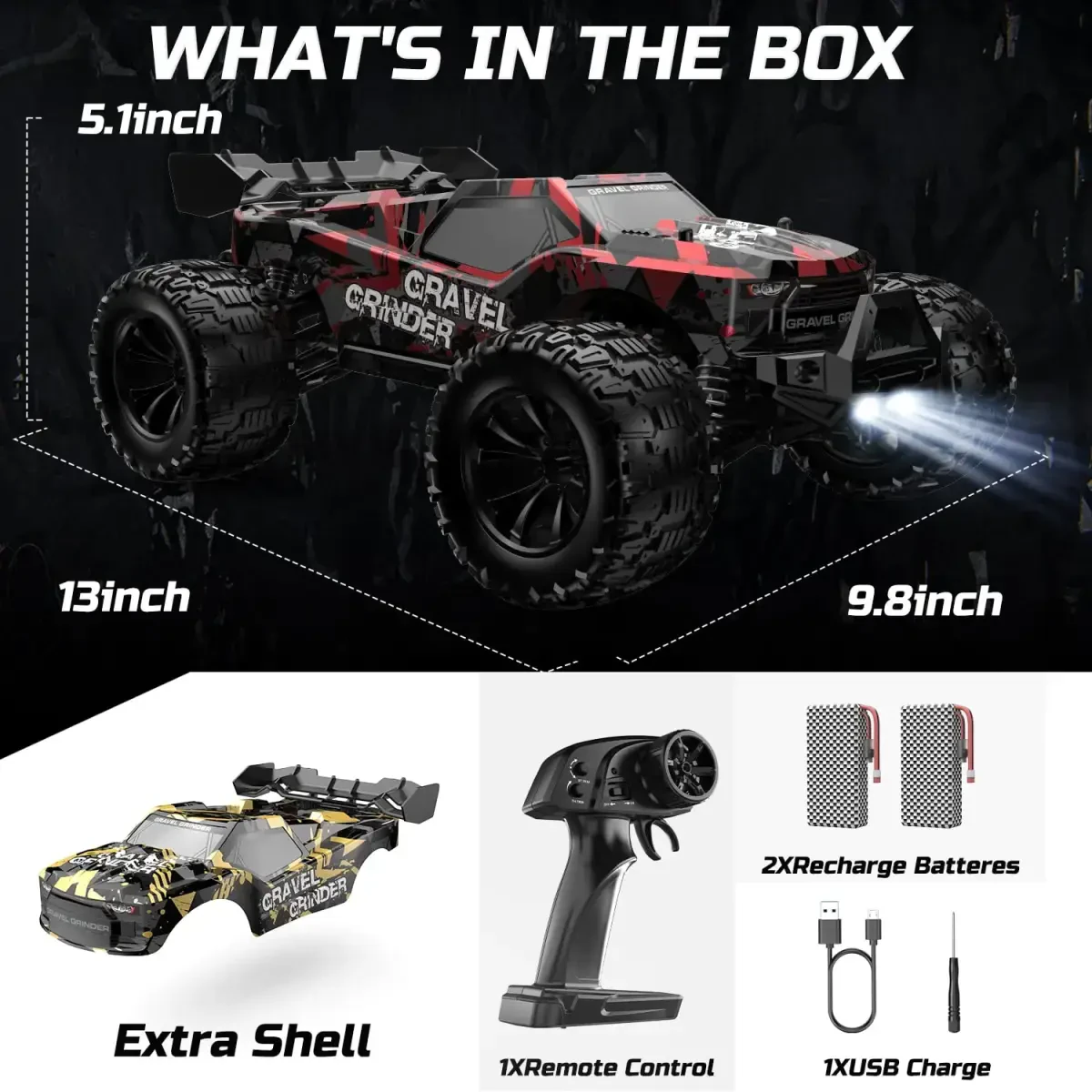 Package contents: 1 RC Monster Truck, 1 2.4GHz Remote Control, 2 Truck Batteries, 1 USB Charging Cable, 1 User Manual, 1 Spare Parts Kit. 3 1.5V AA batteries required for the remote control are not included in the package.