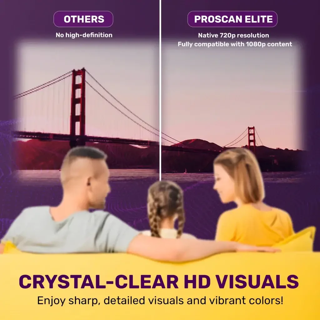 Transform your home into an entertainment hub with the RCA 720P HD ROKU Smart Home Theater Projector. With Roku Express streaming, access thousands of movies, TV shows, and more. 720P HD resolution, 150 ANSI lumens brightness, and built-in speakers deliver crisp visuals, vibrant colors, and an immersive audio experience. Connect your devices effortlessly with versatile connectivity options, and its compact design makes it easy to take entertainment anywhere.