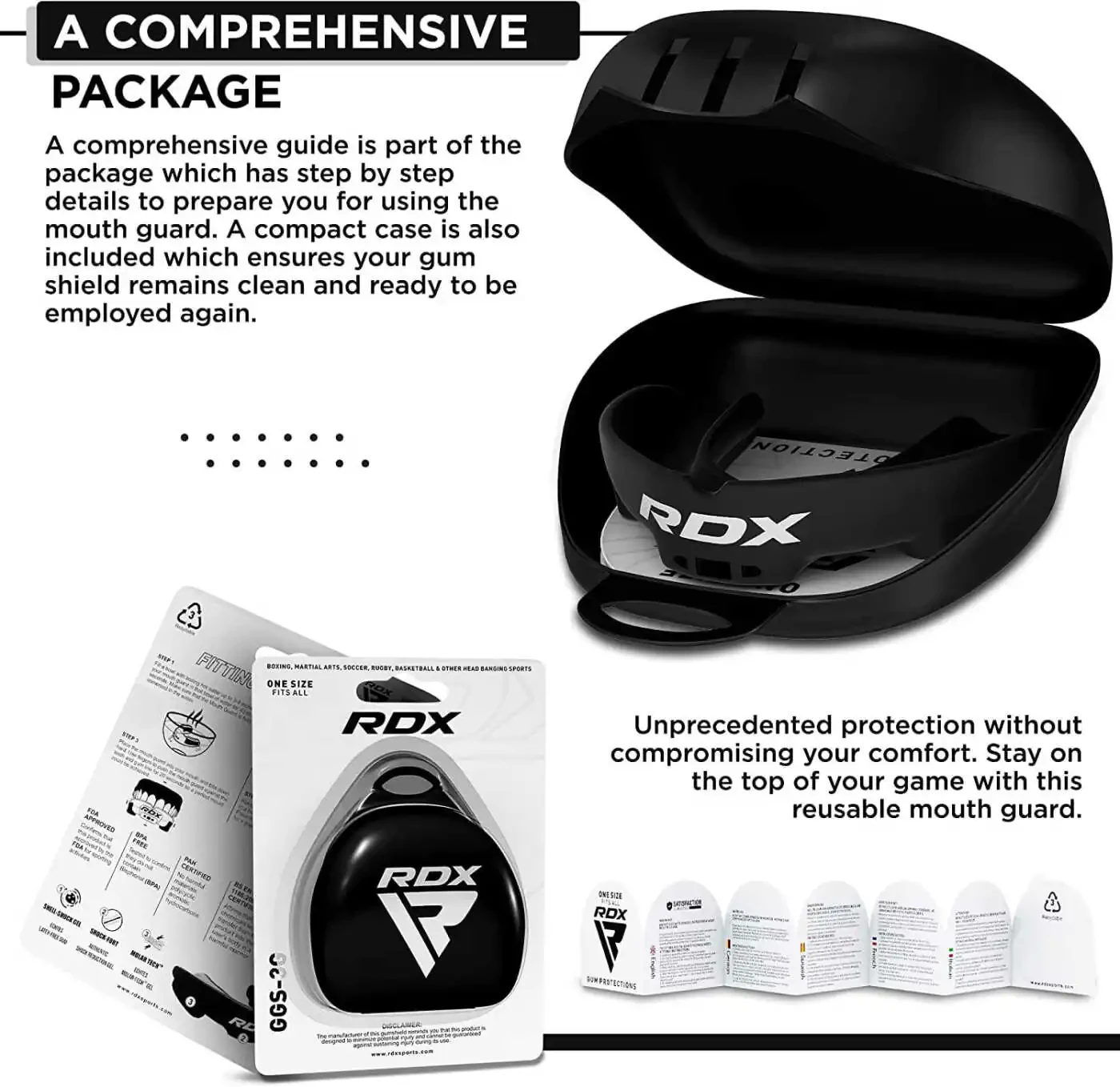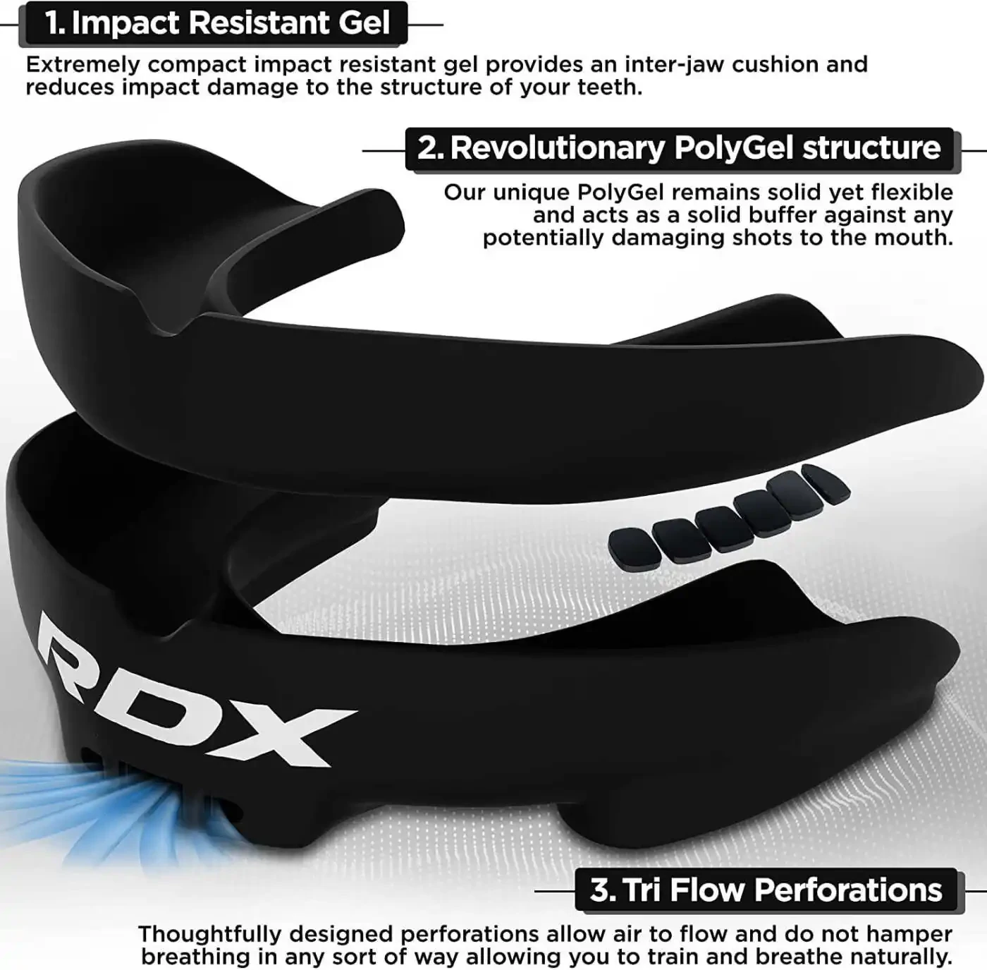 RDX Gum Shield sportchilarning xavfsizligi va ishlashi uchun mo'ljallangan yuqori sifatli og'iz himoyachisidir. Mahsulot zarbani yutuvchi jel tuzilishi, ko'p sportni qo'llab-quvvatlashi, tilni himoya qilish xususiyati, ergonomik dizayni va bardoshli materiali bilan ajralib turadi. RDX sifati bilan ishlab chiqarilgan ushbu og'iz himoyachisi sizning sport hayotingizning ajralmas qismiga aylanadi. Mahsulotingizni uzoqroq ishlatish uchun har foydalanishdan keyin tozalashni va qutisida saqlashni unutmang.