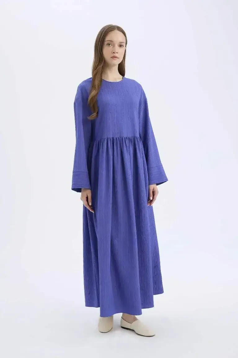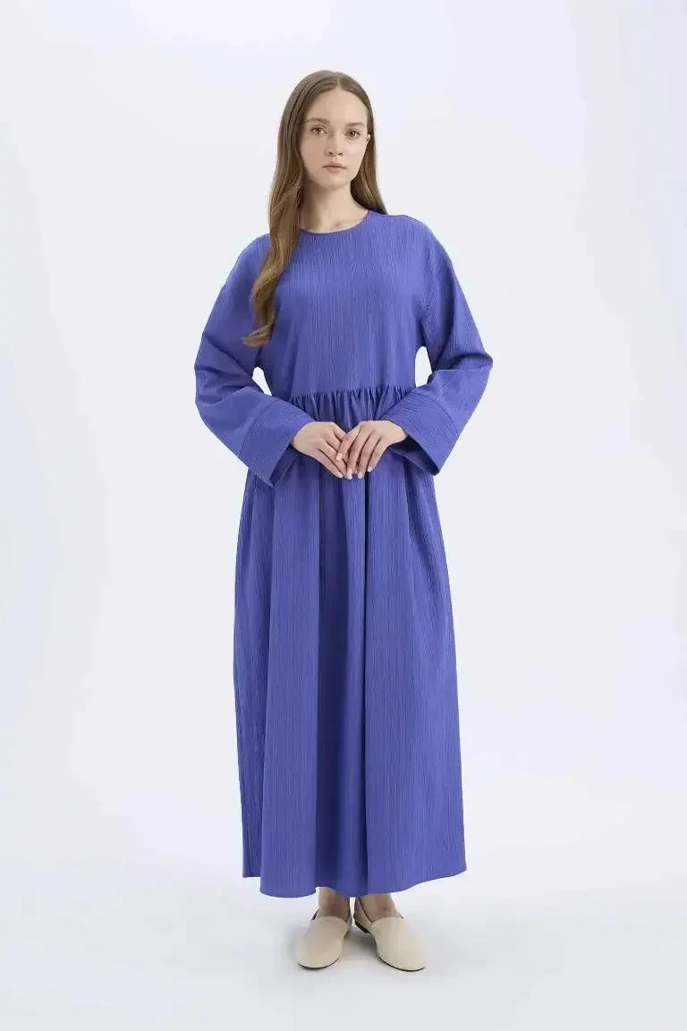 Şıklığı ve rahatlığı bir arada sunan Regular Fit Bisiklet Yaka Gofre Dokulu Uzun Kollu Maxi Elbise ile tanışın! Saks renginin canlılığı ve gofre dokunun özgünlüğüyle tasarlanan bu elbise, gardırobunuzun vazgeçilmezi olacak. Hem günlük kullanımda hem de özel günlerde tercih edebileceğiniz bu şık tasarım, konforlu kesimiyle de dikkat çekiyor. Bisiklet yaka detayı, zarif bir görünüm sunarken, uzun kollu tasarımı sayesinde her mevsim rahatlıkla kullanabilirsiniz. Elbisenin maxi boyu, feminen bir siluet oluştururken, hareket özgürlüğünüzü de kısıtlamıyor.DeFacto markasının kalitesiyle üretilen bu elbise, %99 polyester ve %1 elastan içeriği sayesinde hem dayanıklı hem de esnek bir yapıya sahip. Gofre dokulu kumaş, elbiseye farklı bir boyut katarken, şıklığınızı da ön plana çıkarıyor. İlkbahar/Yaz sezonuna uygun olarak tasarlanan bu elbise, hafif ve nefes alabilen kumaşı sayesinde sıcak havalarda bile konforlu bir kullanım sunuyor. 135 cm yüksekliğindeki bu maxi elbise, her bedene uyum sağlayacak şekilde tasarlanmıştır. Modelin üzerindeki 36 beden ölçüleri (1,77cm boy, 82/60/91 ölçüler) size beden seçimi konusunda fikir verebilir.Regular fit kalıbı sayesinde vücudunuza tam oturan bu elbise, aynı zamanda hareket özgürlüğünüzü de kısıtlamıyor. Günlük kullanım için ideal olan bu elbise, şık bir kombinle özel davetlerde de rahatlıkla tercih edilebilir. Elbiseyi, topuklu ayakkabılar ve şık bir çantayla tamamlayarak elegan bir görünüm elde edebilir, sandaletler ve hasır bir şapka ile kombinleyerek ise daha bohem bir tarz yaratabilirsiniz.Defacto'nun bu özel tasarımı, Türk malı olup, yüksek kalite standartlarına uygun olarak üretilmiştir. Elbisenin renk canlılığını ve dokusunu korumak için bakım talimatlarına uymanız önemlidir. Bu şık ve kullanışlı elbiseyi hemen sepetinize ekleyerek, tarzınızı yansıtmaya başlayın! Unutmayın, bu ürünü evde deneyebilir, beden uyuşmazlığı durumunda (çorap, iç giyim ve takı hariç) mağazalarımızdan ücretsiz olarak değiştirebilirsiniz. Şıklığınızı ve konforunuzu bir araya getiren bu eşsiz elbiseyle her ortamda fark yaratın.