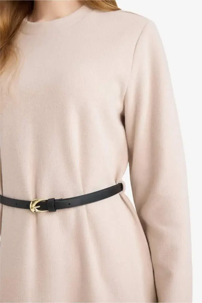 Kemerli Selanik Maxi Elbise | Bisiklet Yaka Uzun Kol Regular Fit