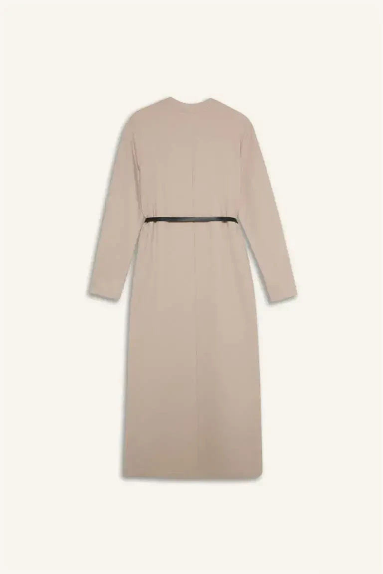 Maxi elbise, selanik kumaş, bisiklet yaka, uzun kollu, kemerli elbise, regular fit, bej elbise, günlük elbise, rahat elbise, şık elbise