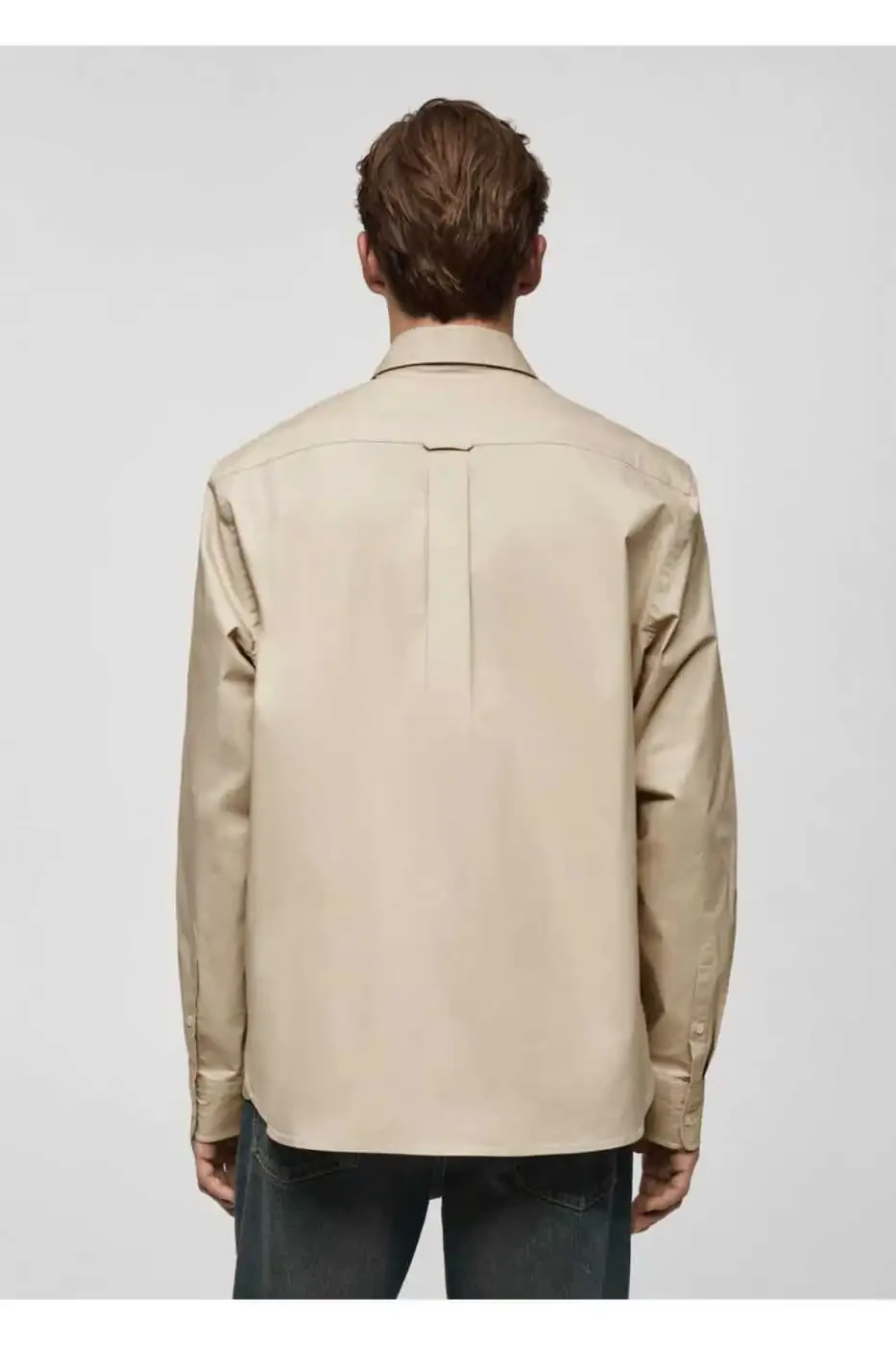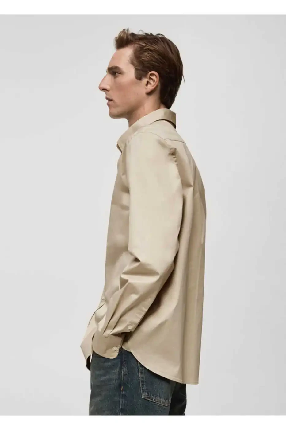 This regular fit cotton shirt is made of a lightweight stretchy cotton fabric. It has long sleeves with buttoned cuffs and a button-front closure. The shirt has a classic collar and a rounded hem. It is machine washable, but bleach should not be used. The model is 185 cm tall and is wearing a size M.