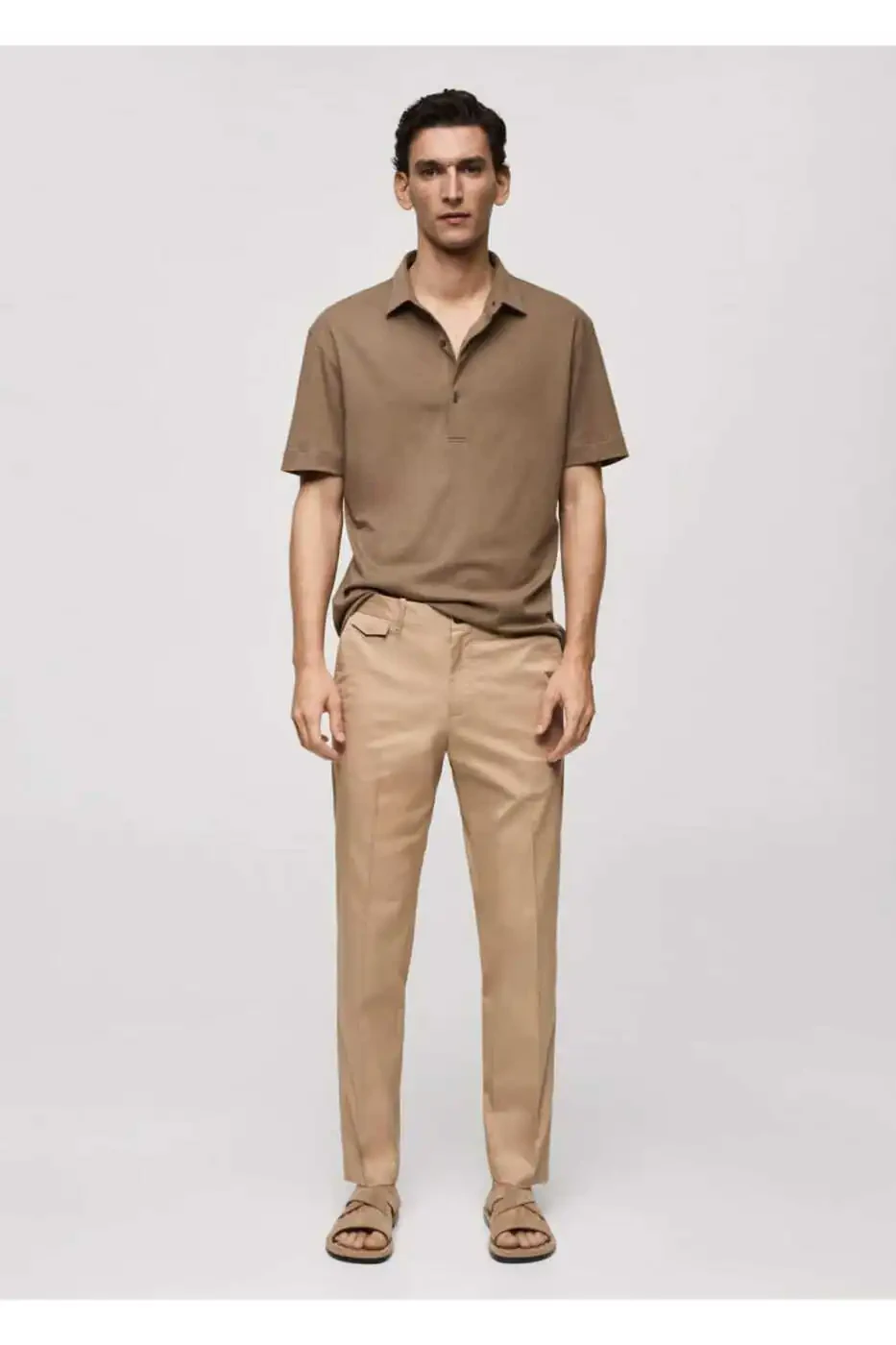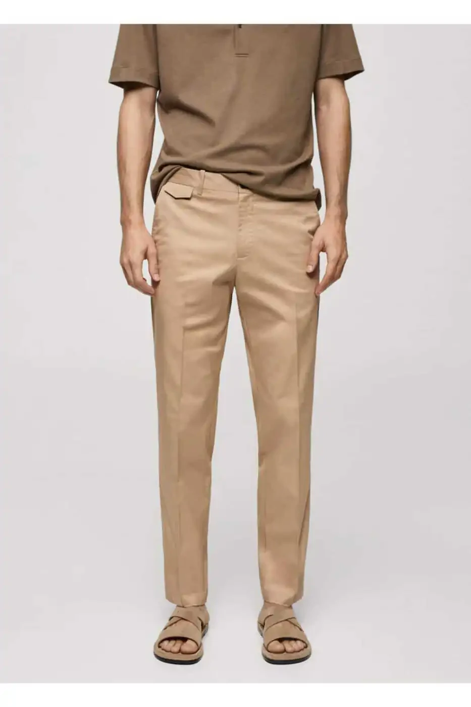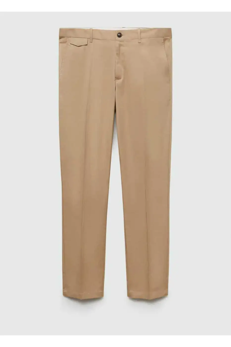 **Regular Fit Cotton Trousers**Shipped by MANGO, these stylish trousers are designed for both comfort and style.**Features:*** Regular fit* Mid-rise* Cotton fabric* Belt loops* Button and zip fly fastening* Two front pockets* Coin pocket at hip* Two back pockets with buttoned flaps* Model is 185 cm and wears a size 42* Pressed crease detail at front and back**Material:*** 97% cotton, 3% elastane* Lining pocket: 65% polyester, 35% cotton**Measurements:*** Inside leg: 79.4 cm* Side seam length: 107.0 cm**Care Instructions:*** Machine wash at max 30°C* Do not bleach* Iron at max 110°C* Do not dry clean* Do not tumble dry**Additional Information:*** Over 100 units available for sale at campaign price.* You can order up to 10 units of this product.* 15-day free return policy applies.