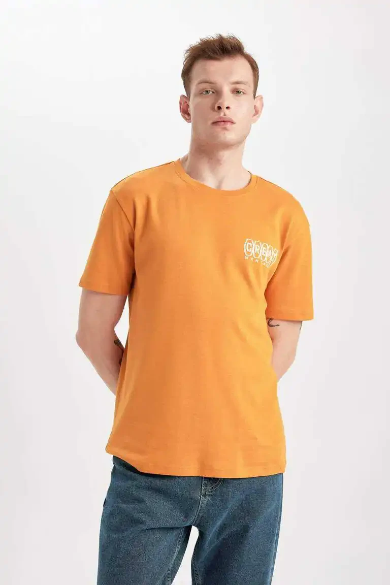 Regular Fit Crew Neck Back Printed Short Sleeve Heavy Fabric T-Shirt - Orange