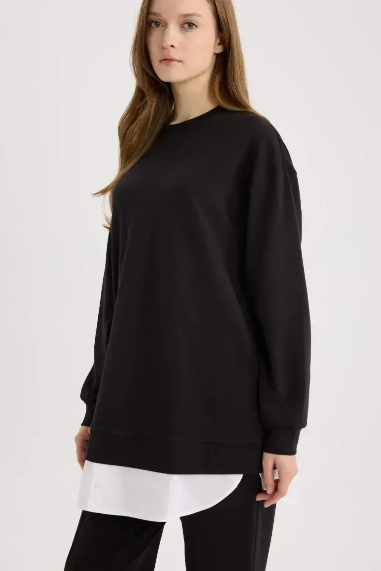 Regular Fit Crew Neck Basic Plain Sweatshirt Tunic-Black is a candidate to be an indispensable part of your wardrobe! Bringing together elegance and comfort, this tunic will complete your style, especially in autumn and winter. Thanks to its high-quality cotton blend fabric, it offers comfort all day long, while its regular fit cut fits your body perfectly and does not restrict your freedom of movement. The crew neck detail creates a simple and elegant look, while the noble stance of black easily adapts to any combination. This tunic, which you can choose for daily use or on a special day, is a versatile piece that can adapt to different styles. The fabric content of the product is 61% cotton, 6% elastane and 33% polyester. This special blend ensures that the tunic is both durable and maintains its shape for a long time. The M size on the model is 1.74 cm tall and has dimensions of 84/61/92. Thanks to different size options, there is an option suitable for every body type. The tunic is designed as 81 cm in S size, 82 cm in M size, 83 cm in L size, 84 cm in XL size and 85 cm in XXL size and 86 cm in 3XL size as shoulder to back length. These measurements will help you better understand the stance of the tunic in different sizes. This sweatshirt tunic is specially designed for adult women and can be easily combined with other pieces in your wardrobe. You can achieve a sporty look with jeans, make a comfortable combination with tights, or use it at a more special event with a stylish skirt. You will always be trendy with the timeless elegance of black. After purchasing the product, you can try it at home and exchange it free of charge at our nearest store if the size does not fit. In this way, you can enjoy online shopping without having to worry about finding the right size. Catch a both stylish and comfortable style with Regular Fit Crew Neck Basic Plain Sweatshirt Tunic-Black!