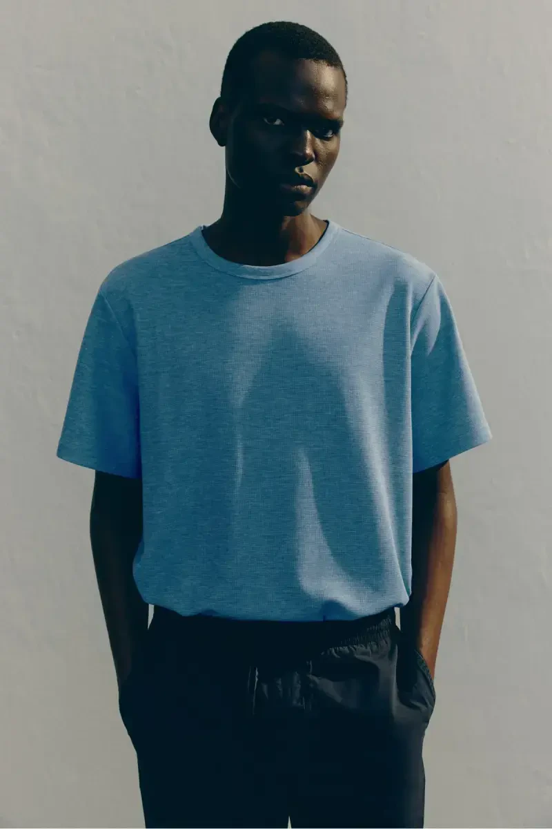 This t-shirt prioritizes comfort with its regular fit and combines elegance and modernity with its honeycomb texture. Its cotton fabric provides breathability all day long, while the light blue color easily complements any outfit. Ideal for everyday wear.